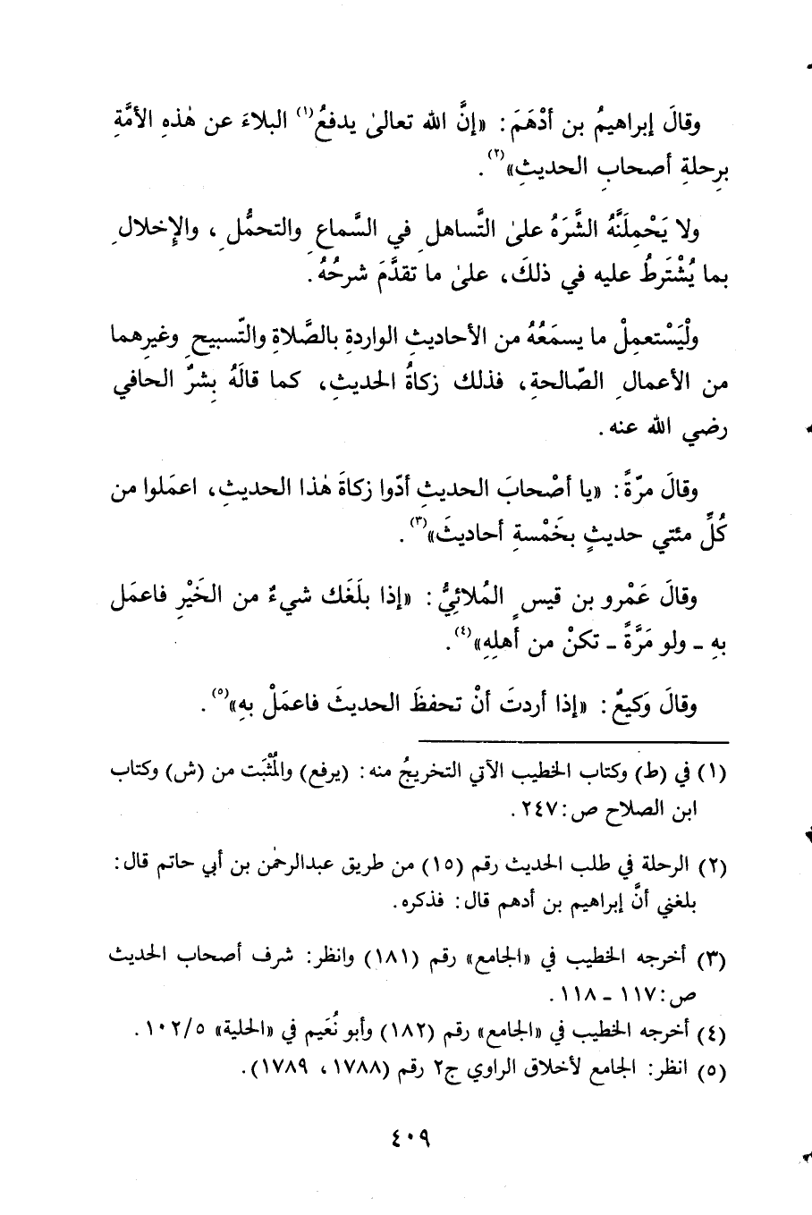 1 - وَقَالَ إِبْرَاهِيم بن ادهم إِن الله تَعَالَى يدْفع الْبلَاء عَن هَذِه الْأمة برحلة أَصْحَاب 2 الحَدِيث