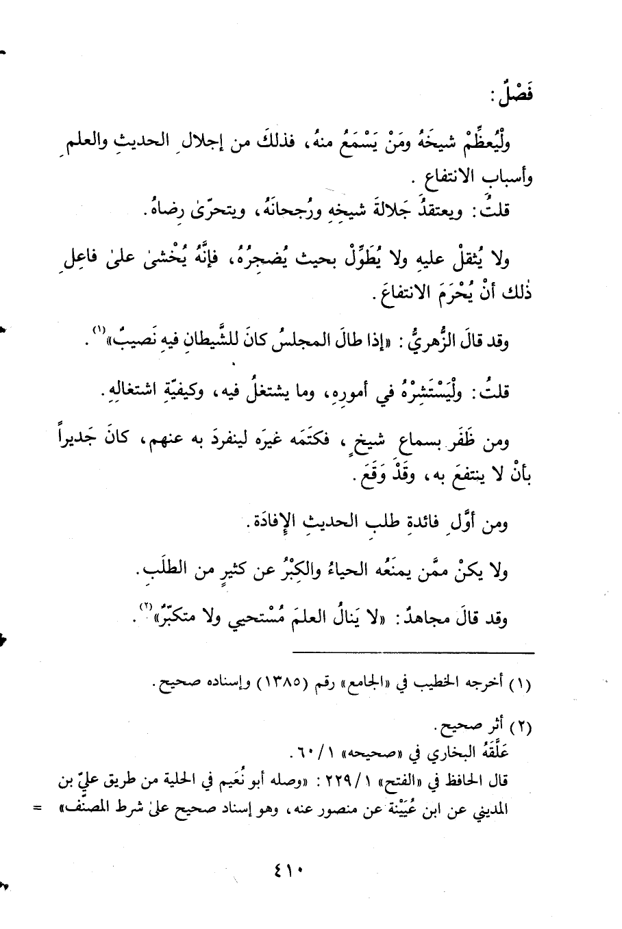 وليعظم شَيْخه وَمن يسمع مِنْهُ فَذَلِك من إجلال الحَدِيث وَالْعلم وَأَسْبَاب الِانْتِفَاع 2