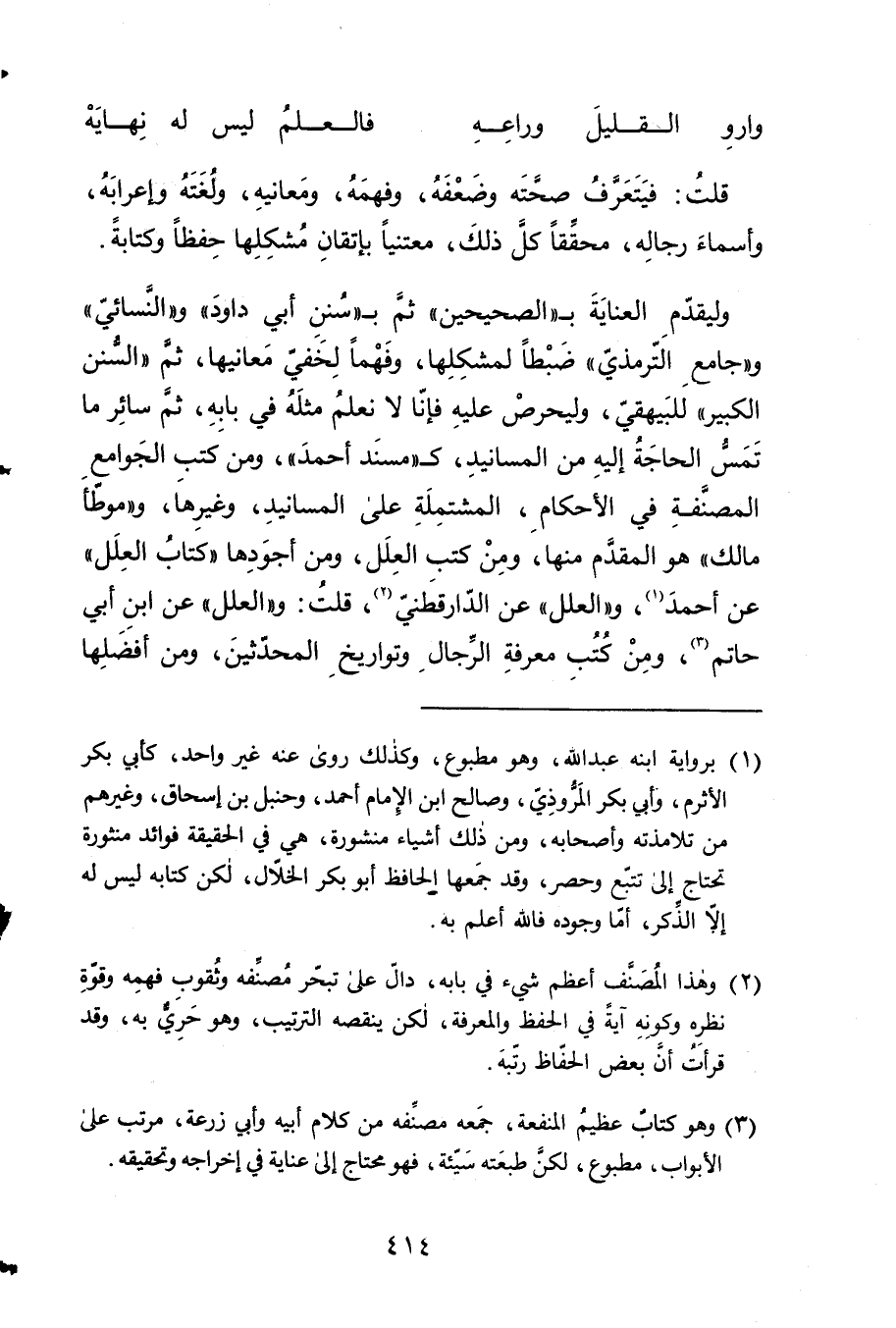 وليقدم الْعِنَايَة ب الصَّحِيحَيْنِ ثمَّ ب سنَن أبي دَاوُد وَالنَّسَائِيّ وجامع التِّرْمِذِيّ ضبطا لمشكلها 4 وفهما لخفي مَعَانِيهَا ثمَّ السّنَن الْكَبِير للبيهقي وليحرص عَلَيْهِ فَإنَّا لَا نعلم مثله فِي بَابه 5 ثمَّ سَائِر مَا تمس الْحَاجة إِلَيْهِ من المسانيد ك مُسْند أَحْمد وَمن كتب الْجَوَامِع المصنفة فِي 6 الْأَحْكَام الْمُشْتَملَة على المسانيد وَغَيرهَا وموطأ مَالك هُوَ الْمُقدم مِنْهَا وَمن كتب الْعِلَل 7 وَمن أَجودهَا كتاب الْعِلَل عَن أَحْمد والعلل عَن الدَّارَقُطْنِيّ قلت والعلل عَن ابْن أبي حَاتِم 8 وَمن كتب معرفَة الرِّجَال وتواريخ الْمُحدثين وَمن أفضلهَا