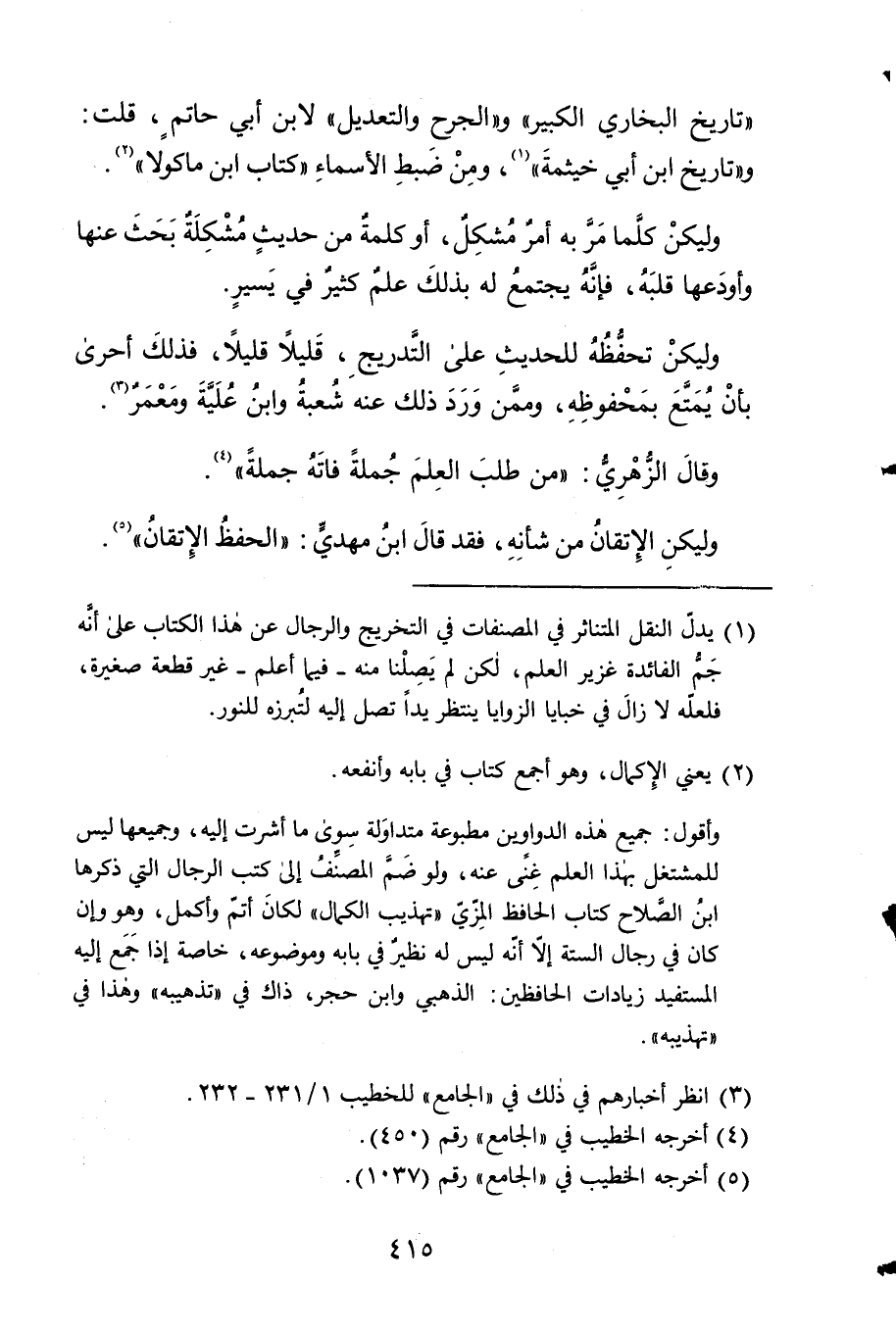 وَليكن تحفظه للْحَدِيث 4 على التدريج قَلِيلا قَلِيلا فَذَلِك أَحْرَى بِأَن يمتع بمحفوظه وَمِمَّنْ ورد ذَلِك عَنهُ شُعْبَة وَابْن 5 عليلة وَمعمر