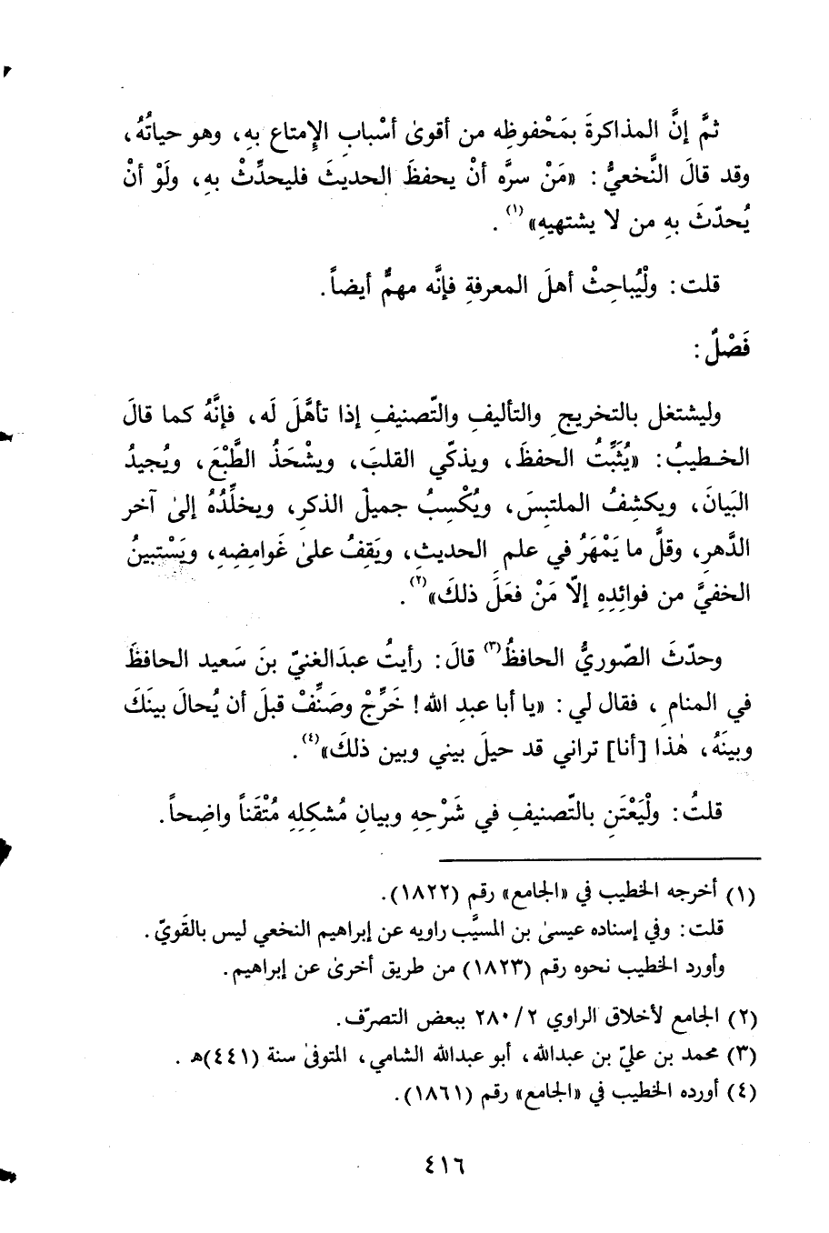 وليشتعل بالتخريج والتأليف والتصنيف إِذا تأهل لَهُ فَإِنَّهُ كَمَا قَالَ 4 الْخَطِيب يثبت الْحِفْظ ويذكي الْقلب ويشحذ الطَّبْع ويجيد الْبَيَان ويكشف الملتبس ويكسب جميل 5 الذّكر ويخلده إِلَى آخر الدَّهْر وَقل مَا يمهر فِي علم الحَدِيث وَيقف عل غوامضه ويستبين الْخَفي 6 من فَوَائده إِلَّا من فعل ذَلِك