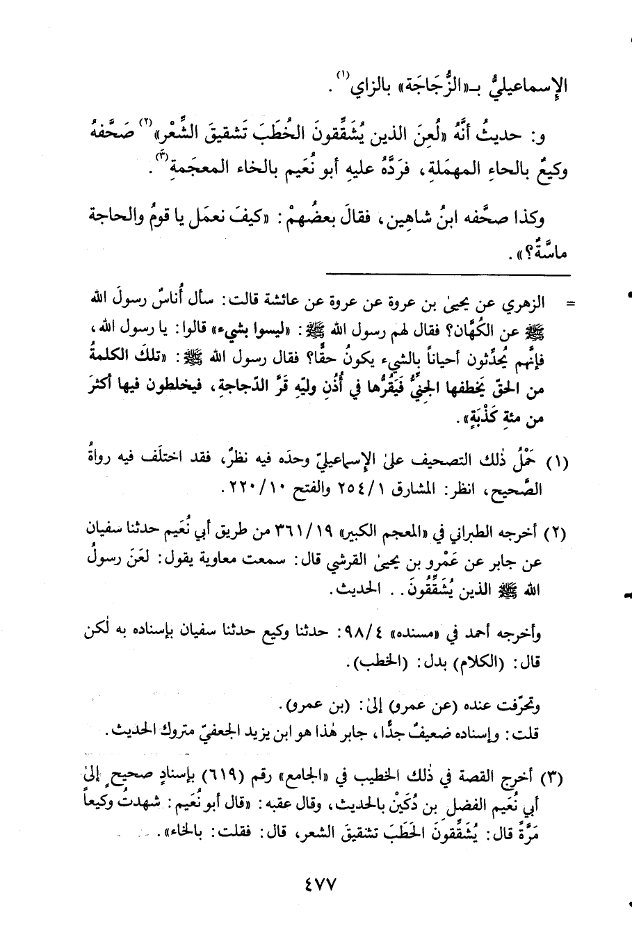 وَحَدِيث أَنه لعن الَّذين يشققون الْخطب تشقيق الشّعْر صحفه وَكِيع بِالْحَاء الْمُهْملَة فَرده عَلَيْهِ أَبُو نعيم بِالْخَاءِ الْمُعْجَمَة