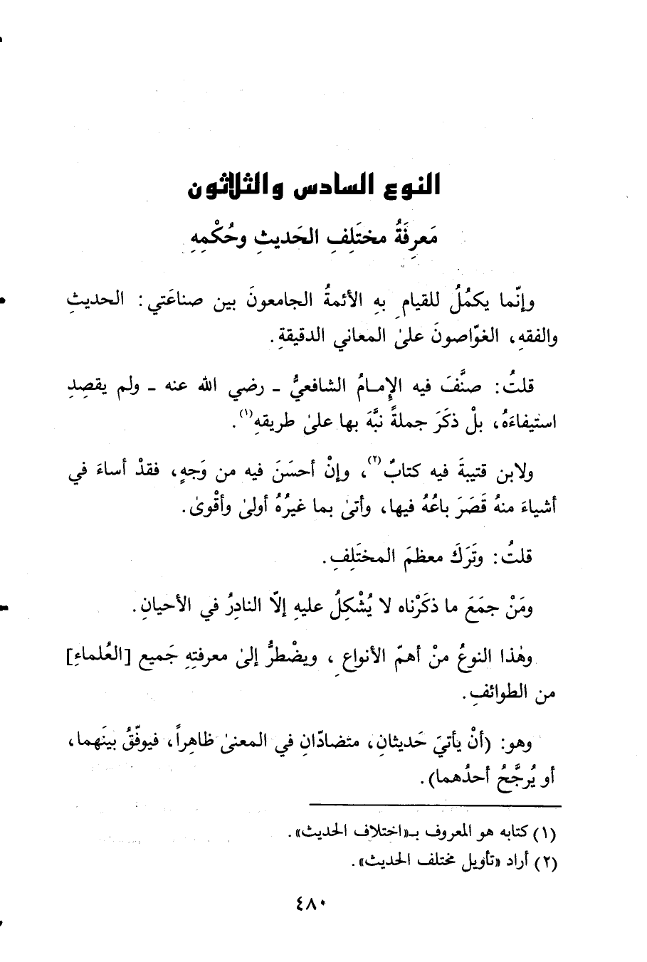 قلت وَترك مُعظم الْمُخْتَلف وَمن جمع مَا ذَكرْنَاهُ لَا يشكل عَلَيْهِ إِلَّا النَّادِر فِي الأحيان وَهَذَا النَّوْع من أهم الْأَنْوَاع ويضطر إِلَى مَعْرفَته جَمِيع الْعلمَاء من الطوائف وَهُوَ أَن يَأْتِي حديثان متضادان فِي الْمَعْنى ظَاهرا فيوفق بَينهمَا أَو يرجح أَحدهمَا