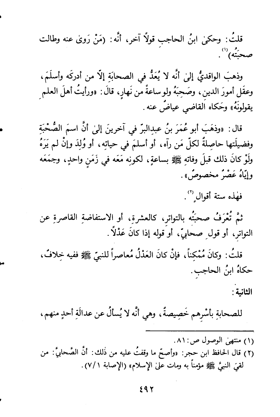 قَالَ وَذهب أَبُو عمر بن عبد الْبر فِي آخَرين إِلَى أَن اسْم الصُّحْبَة وفضيلتها حَاصِلَة لكل من رَآهُ أَو أسلم فِي حَيَاته أَو ولد وَإِن لم يره وَلَو كَانَ ذَلِك قبل وَفَاته صلى الله عَلَيْهِ وَسلم بساعة لكَونه مَعَه فِي زمن وَاحِد وَجمعه وإياه عصر مَخْصُوص