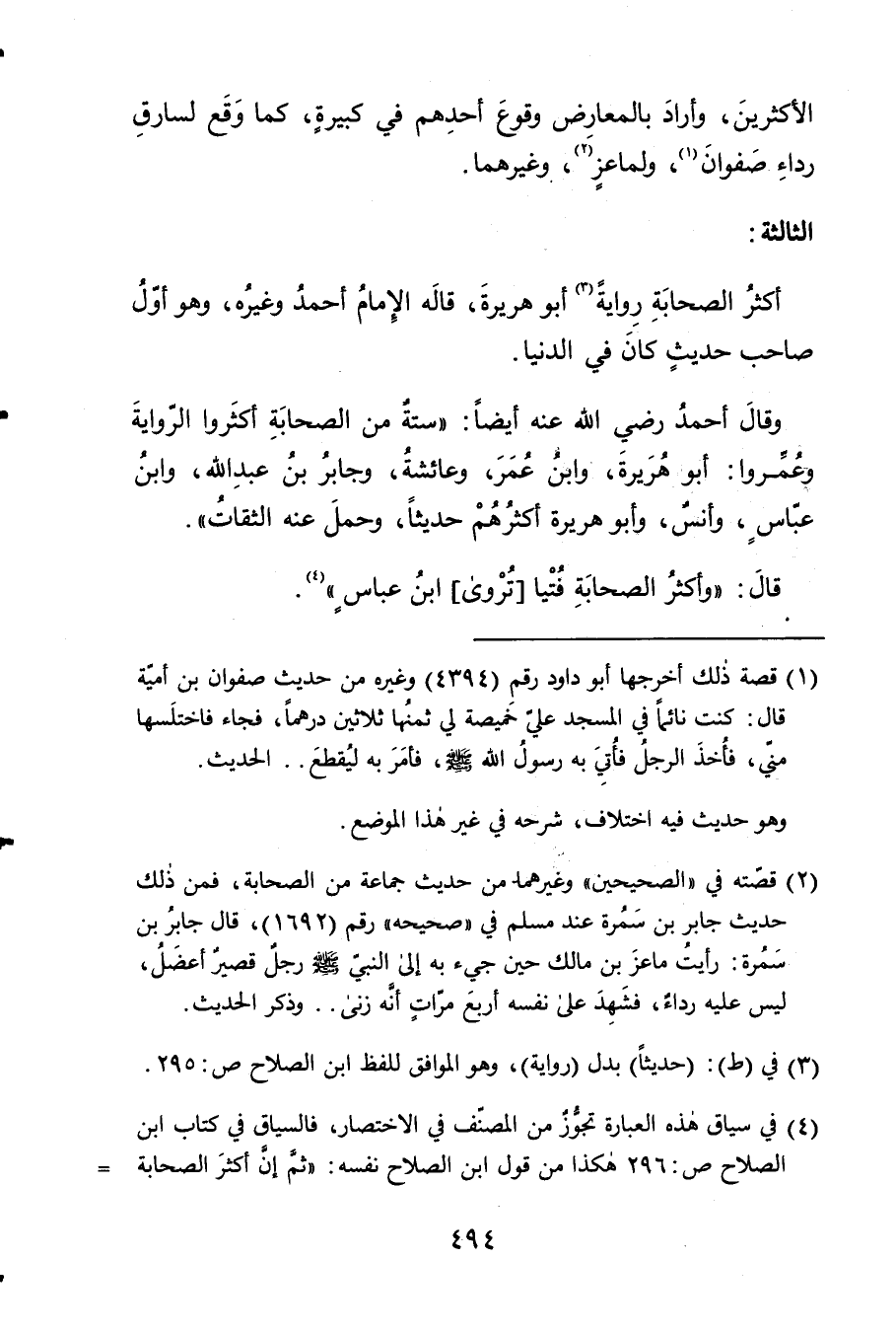 أَكثر الصَّحَابَة رِوَايَة أَبُو هُرَيْرَة قَالَه الإِمَام أَحْمد وَغَيره وَهُوَ أول صَاحب حَدِيث كَانَ فِي الدِّينَا وَقَالَ أَحْمد رَضِي الله عَنهُ أَيْضا سِتَّة من الصَّحَابَة أَكْثرُوا الرِّوَايَة وعمروا أَبُو هُرَيْرَة وَابْن عمر وَعَائِشَة وَجَابِر بن عبد الله وَابْن عَبَّاس وَأنس وَأَبُو هُرَيْرَة أَكْثَرهم حَدِيثا وَحمل عَنهُ الثِّقَات