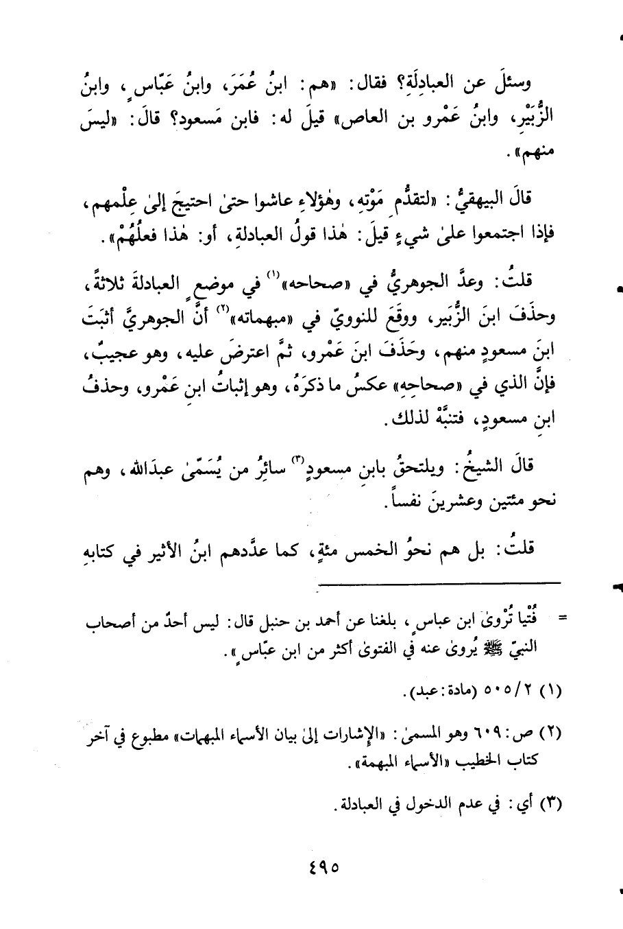 قلت وعد الْجَوْهَرِي فِي صحاحه فِي مَوضِع العبادلة ثَلَاثَة وَحذف ابْن الزبير وَوَقع للنووي فِي مبهماته أَن الْجَوْهَرِي أثبت ابْن مَسْعُود مِنْهُم وَحذف ابْن عَمْرو ثمَّ اعْترض عَلَيْهِ وَهُوَ عَجِيب فَإِن الَّذِي فِي صحاحه عكس مَا ذكره وَهُوَ إِثْبَات ابْن عَمْرو وَحذف ابْن مَسْعُود فَتنبه لذَلِك
