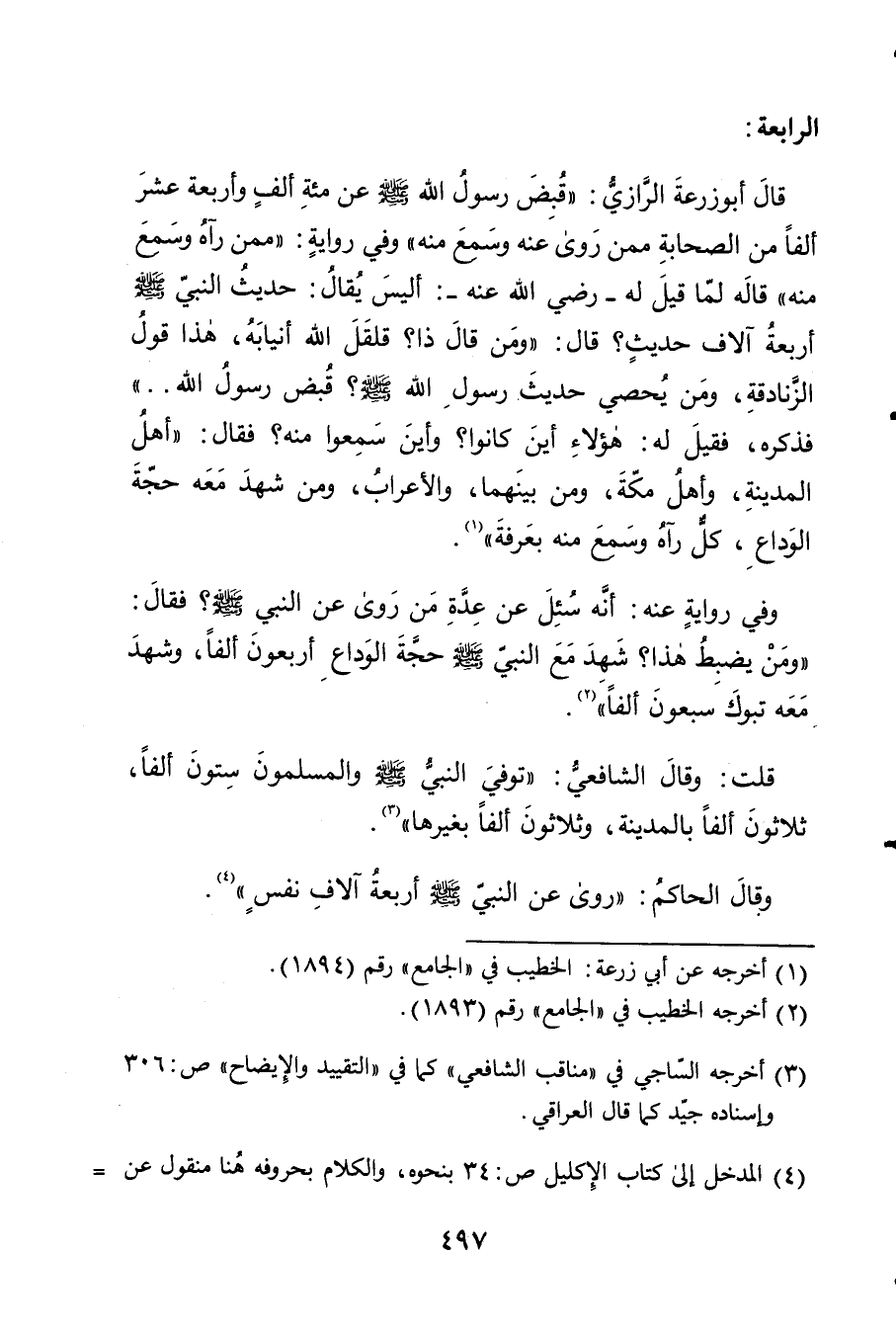 قَالَ أَبُو زرْعَة الرَّازِيّ قبض رَسُول الله صلى الله عَلَيْهِ وَسلم عَن مئة ألف وَأَرْبَعَة عشر ألف من الصَّحَابَة مِمَّن روى عَنهُ وَسمع مِنْهُ وَفِي رِوَايَة مِمَّن رَآهُ وَسمع مِنْهُ قَالَ لما قيل لَهُ رَضِي الله عَنهُ أَلَيْسَ يُقَال حَدِيث النَّبِي صلى الله عَلَيْهِ وَسلم أَرْبَعَة آلَاف حَدِيث قَالَ وَمن قَالَ ذَا قلقل الله أنيابه هَذَا قَول الزَّنَادِقَة وَمن يحصي حَدِيث رَسُول الله صلى الله عَلَيْهِ وَسلم قبض رَسُول الله فَذكره فَقيل لَهُ هَؤُلَاءِ أَيْن كَانُوا وَأَيْنَ سمعُوا مِنْهُ فَقَالَ أهل الْمَدِينَة وَأهل مَكَّة وَمن بَينهمَا والأعراب وَمن شهد مَعَه حجَّة الْوَدَاع كل رَآهُ وَسمع مِنْهُ بِعَرَفَة