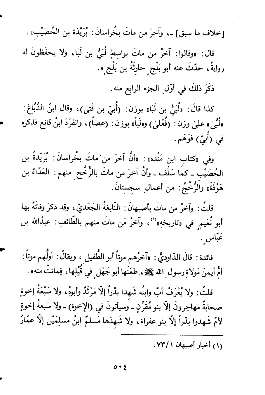 قلت وَآخر من مَاتَ بأصبهان النَّابِغَة الْجَعْدِي وَقد ذكر وَفَاته بهَا أَبُو نعيم فِي تَارِيخه وَآخر من مَاتَ مِنْهُم بِالطَّائِف عبد الله بن عَبَّاس