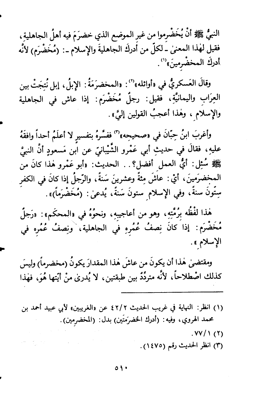 وَقَالَ العسكري فِي أَوَائِله المخضرمة الْإِبِل إبل نتجت بَين العراب واليمانية فَقيل رجل مخضرم إِذا عَاشَ فِي الْجَاهِلِيَّة وَالْإِسْلَام وَهَذَا أعجب الْقَوْلَيْنِ إِلَيّ