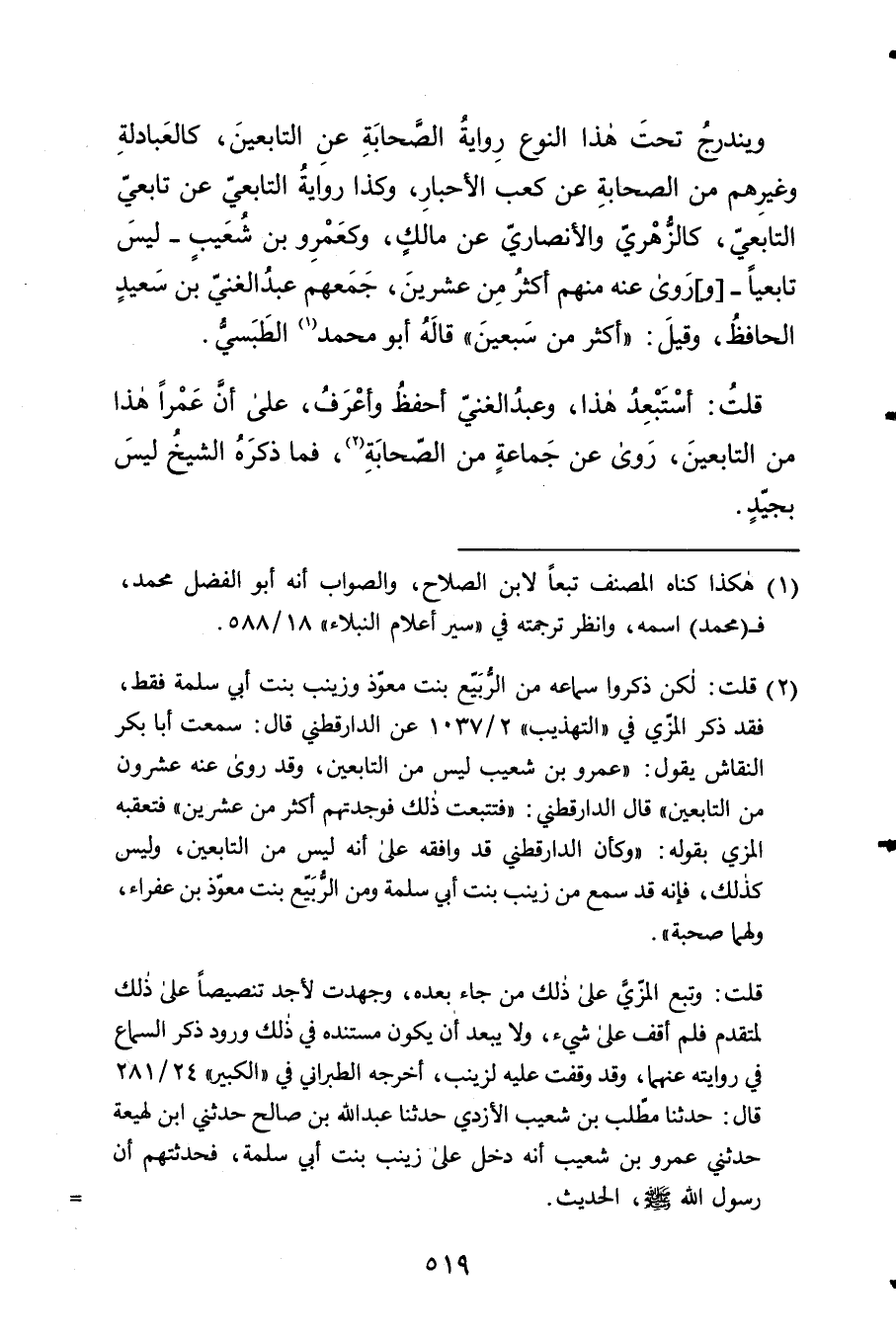 ويندرج تَحت هَذَا النَّوْع رِوَايَة الصَّحَابَة عَن التَّابِعين كالعبادلة وَغَيرهم من الصَّحَابَة عَن كَعْب الْأَحْبَار وَكَذَا رِوَايَة التَّابِعِيّ عَن تَابِعِيّ التَّابِعِيّ كالزهري والأنصاري عَن مَالك وكعمرو بن شُعَيْب لَيْسَ تابعيا وروى عَنهُ مِنْهُم أَكثر من عشْرين جمعهم عبد الْغَنِيّ بن سعيد الْحَافِظ وَقيل أَكثر من سبعين قَالَه أَبُو مُحَمَّد الطبسي