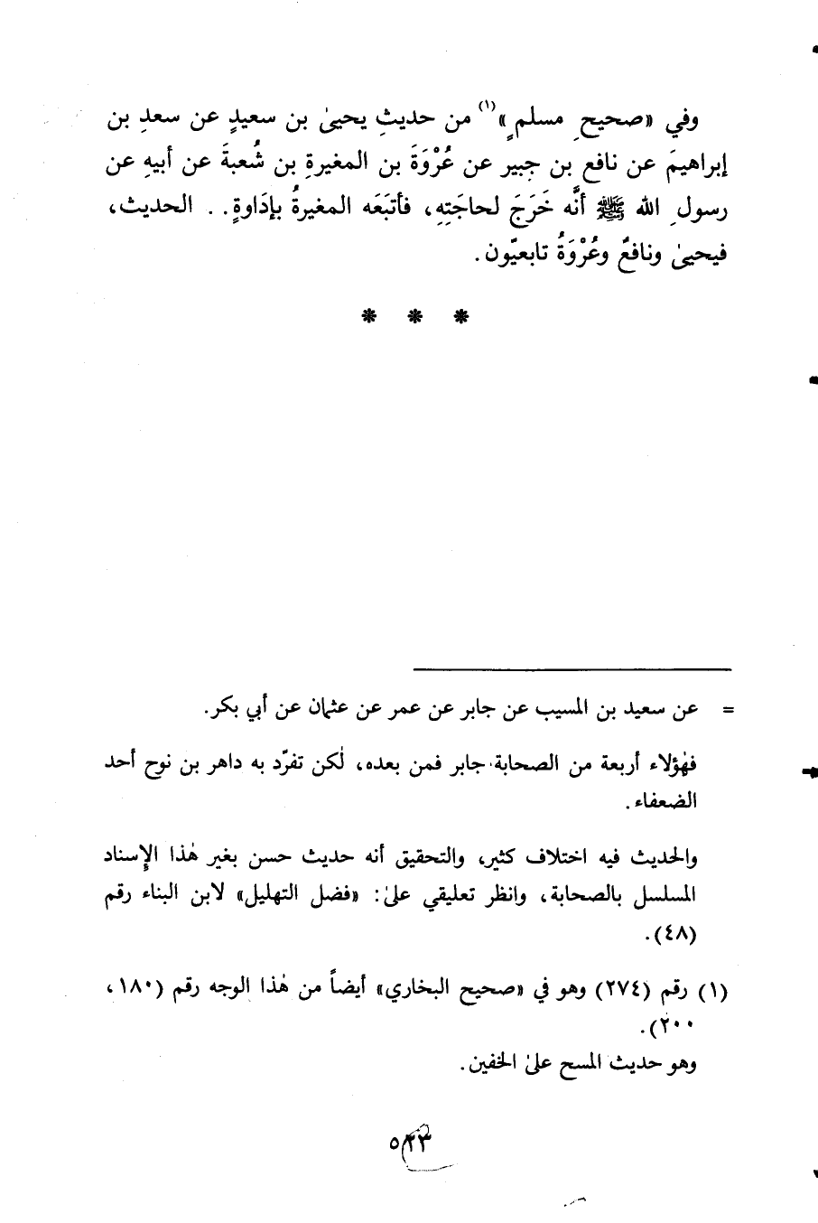 وَفِي صَحِيح مُسلم من حَدِيث يحيى بن سعي عَن سعد بن إِبْرَاهِيم عَن نَافِع بن جُبَير عَن عُرْوَة بن الْمُغيرَة بن شُعْبَة عَن أَبِيه عَن رَسُول الله صلى الله عَلَيْهِ وَسلم أَنه خرج لِحَاجَتِهِ فَأتبعهُ الْمُغيرَة بإداوة الحَدِيث فيحيى وَنَافِع وَعُرْوَة تابعيون