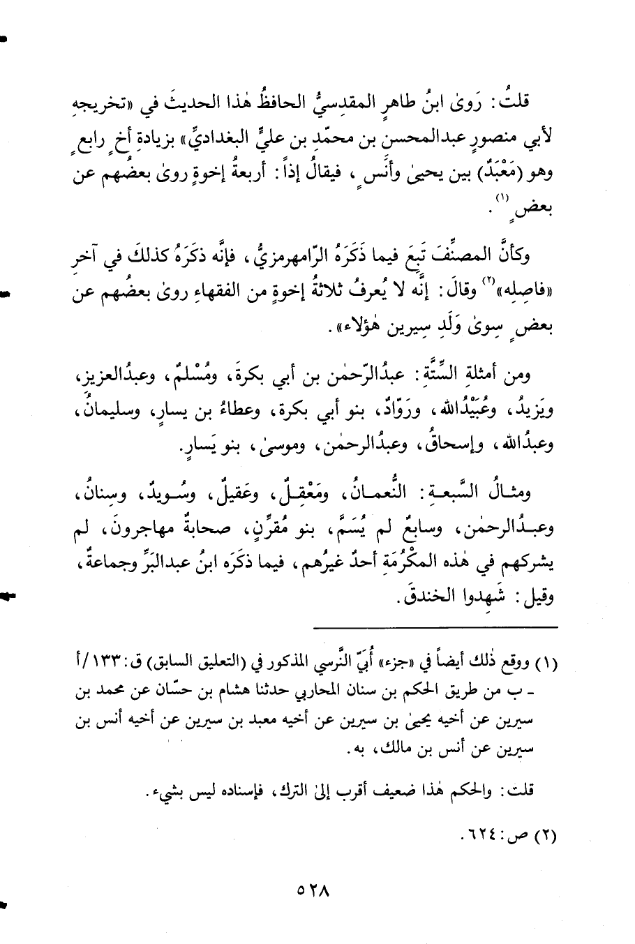وَمن أَمْثِلَة السِّتَّة عبد الرَّحْمَن بن أبي بكرَة وَمُسلم وَعبد الْعَزِيز وَيزِيد وَعبد الله ورواد بَنو أبي بكرَة وَعَطَاء بن يسَار وَسليمَان وَعِيد الله وَإِسْحَاق وَعبد الرَّحْمَن ومُوسَى بَنو يسَار