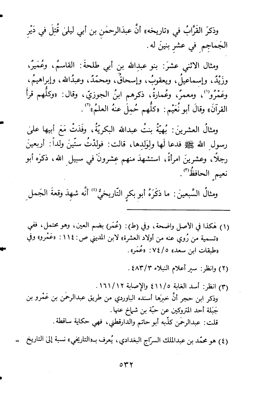 وَمِثَال الاثنى عشر بَنو عبد الله بن أبي طَلْحَة الْقَاسِم وَعُمَيْر وَزيد وَإِسْمَاعِيل وَيَعْقُوب وَإِسْحَاق وَمُحَمّد وَعبد الله وَإِبْرَاهِيم وَعَمْرو وَمعمر وَعمارَة ذكرهم ابْن الْجَوْزِيّ وَقَالَ كلهم قَرَأَ الْقُرْآن وَقَالَ أَبُو نعيم كلهم حمل عَنهُ الْعلم