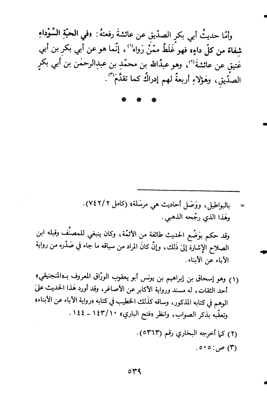 وَأما حَدِيث أبي بكر الصّديق عَن عَائِشَة رفعته فِي الْحبَّة السَّوْدَاء شِفَاء من كل دَاء فَهُوَ غلط مِمَّن رَوَاهُ إِنَّمَا هُوَ عَن أبي بكر بن أبي عَتيق عَن عَائِشَة وَهُوَ عبد الله بن مُحَمَّد بن عبد الرَّحْمَن بن أبي بكر الصّديق وَهَؤُلَاء أَرْبَعَة لَهُم إِدْرَاك كَمَا تقدم