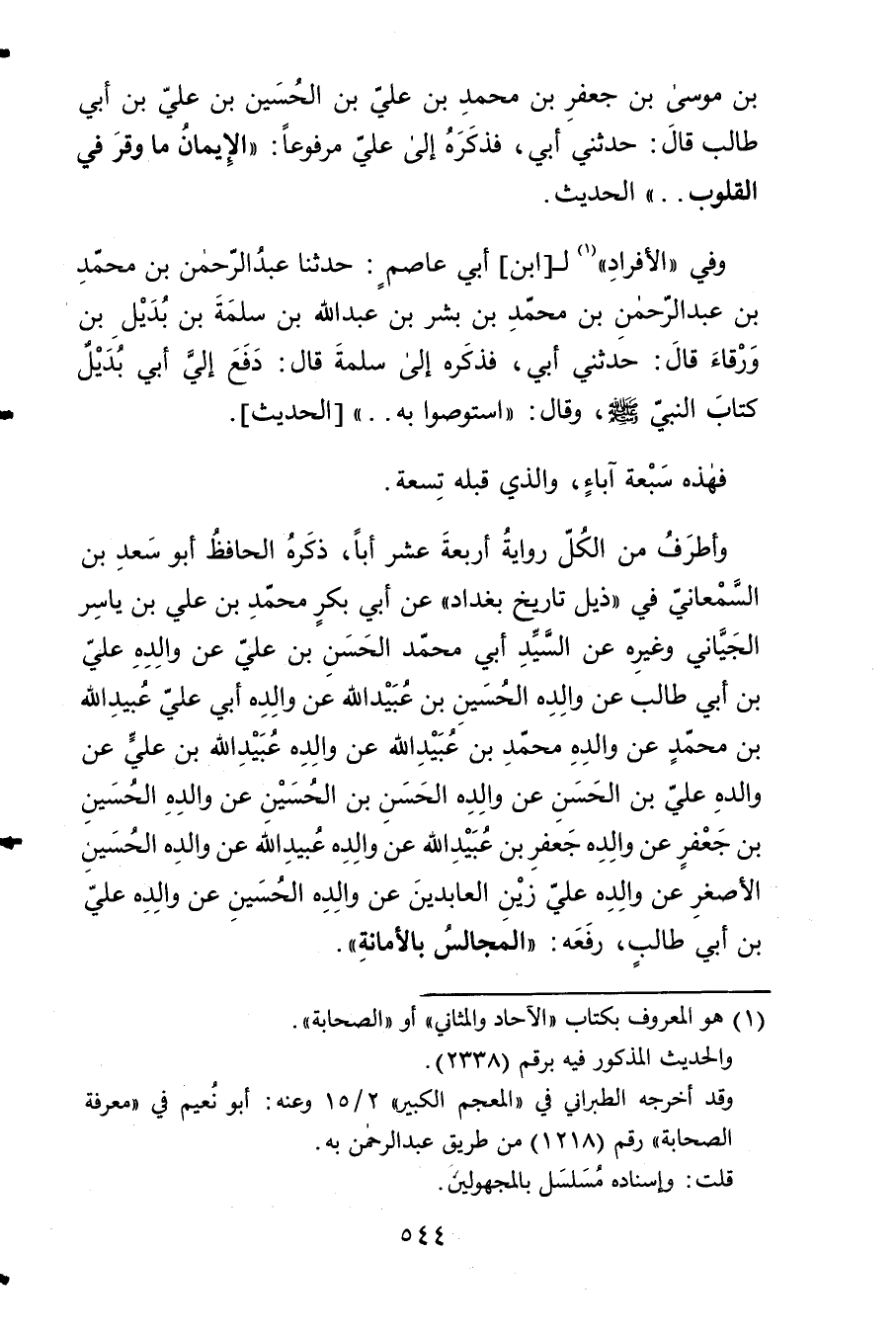 وأطرف من الْكل رِوَايَة أَرْبَعَة عشر أَبَا ذكره الْحَافِظ أَبُو سعد بن السَّمْعَانِيّ فِي ذيل تَارِيخ بَغْدَاد عَن أبي بكر مُحَمَّد بن عَليّ بن يَاسر الجياني وَغَيره عَن السَّيِّد أبي مُحَمَّد الْحسن بن عَليّ عَن وَالِده عَليّ بن أبي طَالب عَن وَالِده الْحُسَيْن بن عبيد الله عَن وَالِده أبي عَليّ عبيد الله بن مُحَمَّد عَن وَالِده مُحَمَّد بن عبيد الله عَن وَالِده عبيد الله بن عَليّ عَن وَالِده عَليّ بن الْحسن عَن وَالِده الْحسن بن الْحُسَيْن عَن وَالِده الْحُسَيْن بن جَعْفَر عَن وَالِده جَعْفَر بن عبيد الله عَن وَالِده عبيد الله عَن وَالِده الْحُسَيْن الْأَصْغَر عَن وَالِده عَليّ زين العابدين عَن وَالِده الْحُسَيْن عَن وَالِده عَليّ بن أبي طَالب رَفعه الْمجَالِس بالأمانة