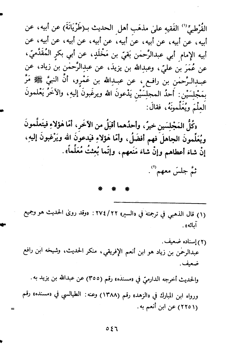 الْقُرْطُبِيّ الْفَقِيه على مَذْهَب أهل الحَدِيث بطريانة عَن أَبِيه عَن أَبِيه عَن أَبِيه عَن أَبِيه عَن أَبِيه عَن أَبِيه عَن أَبِيه عَن أَبِيه عَن أَبِيه الإِمَام أبي عبد الرَّحْمَن بَقِي بن مخلد عَن أبي بكر الْمقدمِي عَن عمر بن عَليّ وَعبد الله بن يزِيد عَن عبد الرَّحْمَن بن زِيَاد عَن عبد الرَّحْمَن بن عَليّ بن رَافع عَن عبد الله بن عَمْرو أَن النَّبِي صلى الله عَلَيْهِ وَسلم مر بمجلسين أحد المجلسين يدعونَ الله ويرغبون إِلَيْهِ وَالْآخر يعلمُونَ الْعلم ويعلمونه فَقَالَ