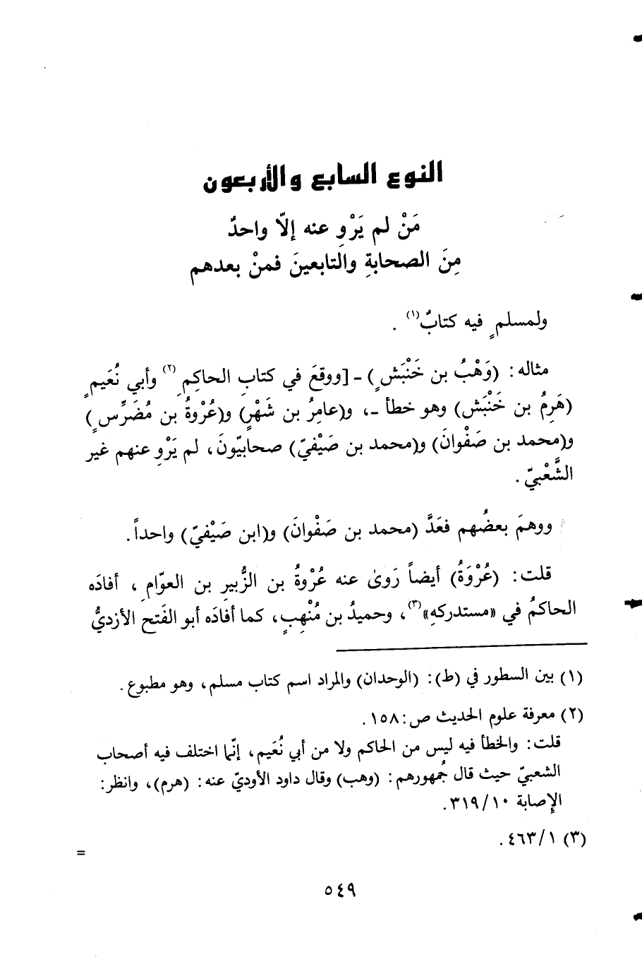 النَّوْع السَّابِع وَالْأَرْبَعُونَ من لم يرو عَنهُ إِلَّا وَاحِد من الصَّحَابَة وَالتَّابِعِينَ فَمن بعدهمْ