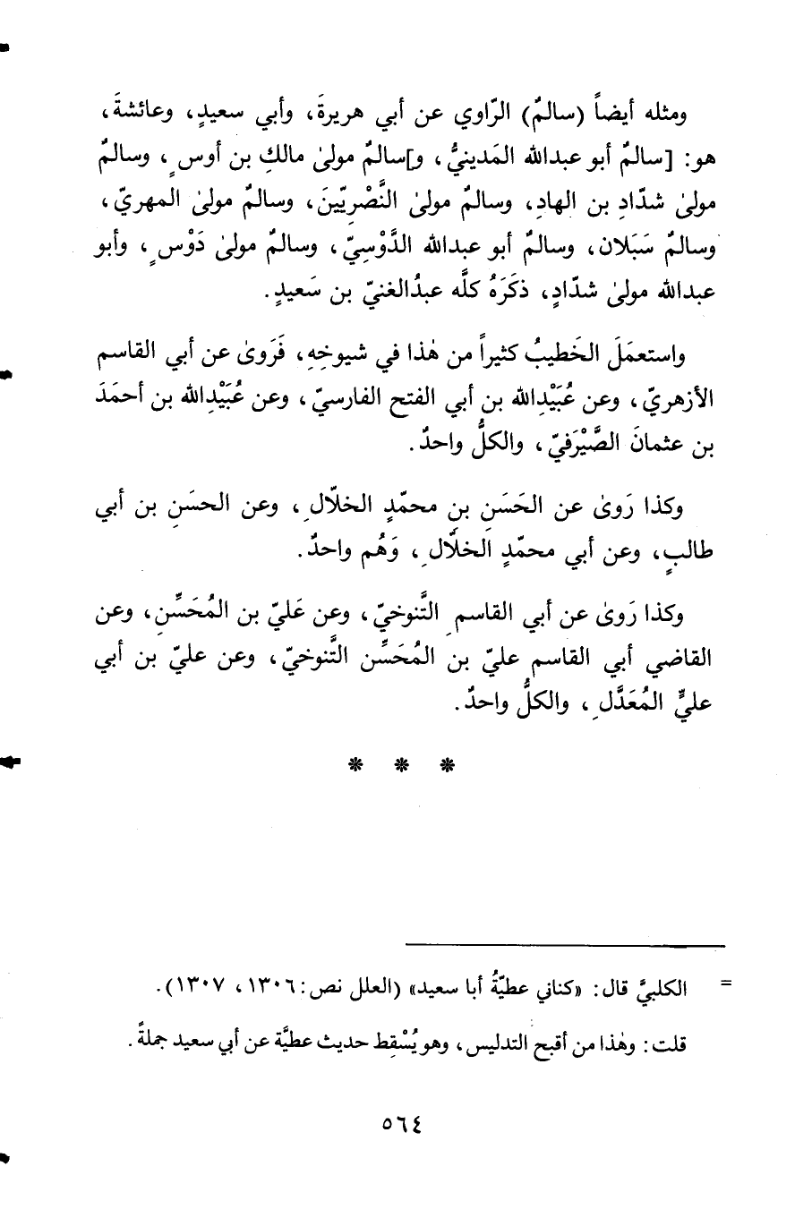 ومثاله أَيْضا سَالم الرَّاوِي عَن أبي هُرَيْرَة وَأبي سعيد وَعَائِشَة هُوَ سَالم أَبُو عبد الله الْمَدِينِيّ وَسَالم مولى مَالك بن أَوْس وَسَالم مولى شَدَّاد بن الْهَاد وَسَالم مولى النصريين وَسَالم مولى الْمهرِي وَسَالم سبلان وَسَالم أَبُو عبد الله الدوسي وَسَالم مولى دوس وَأَبُو عبد الله مولى شَدَّاد ذكره كُله عبد الْغَنِيّ بن سعيد