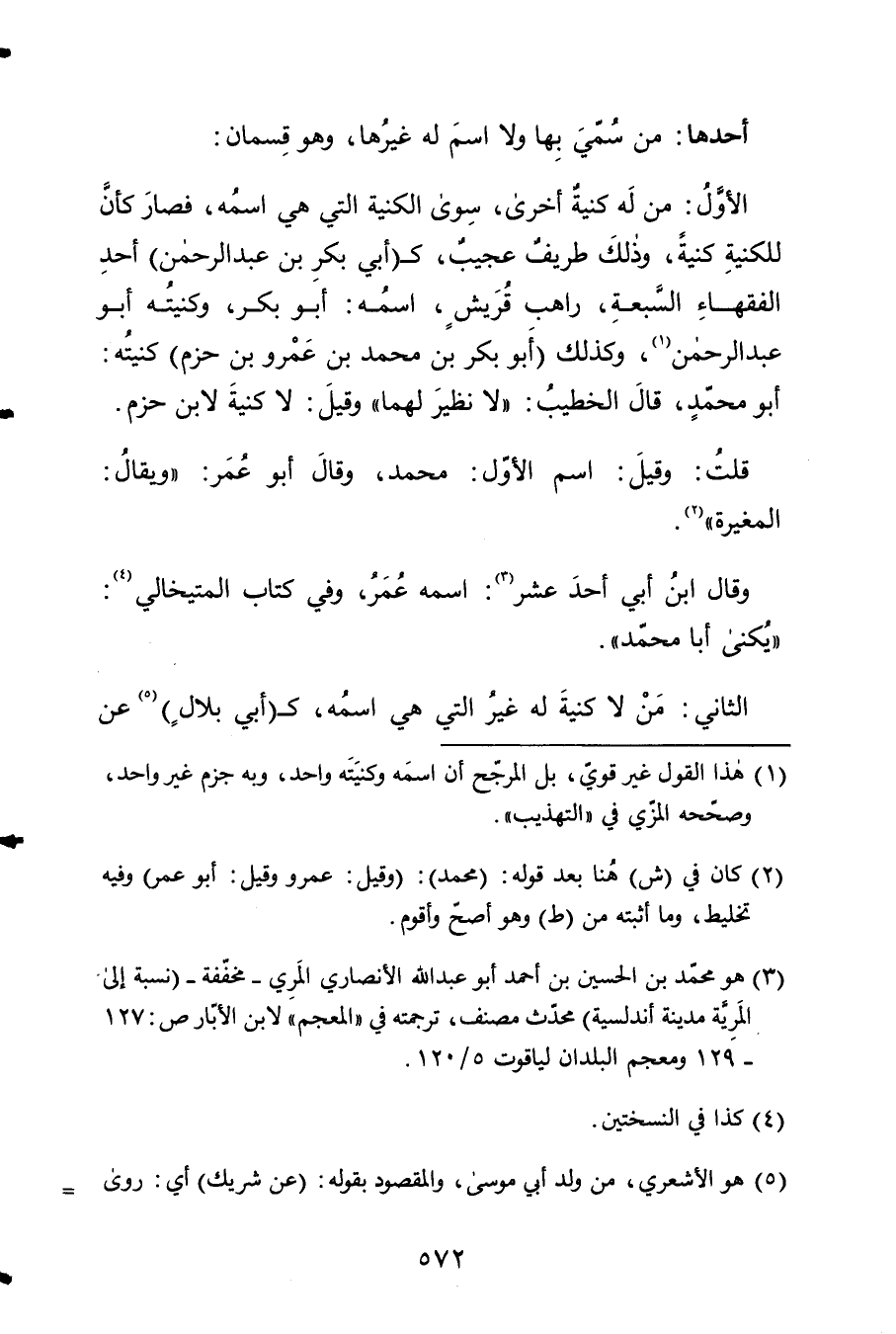 الأول من لَهُ كنية أُخْرَى سوى الكنية الَّتِي هِيَ اسْمه فَصَارَ كَأَن للكنية كنية وَذَلِكَ طريف عَجِيب كَأبي بكر بن عبد الرَّحْمَن أحد الْفُقَهَاء السَّبْعَة رَاهِب قُرَيْش اسْمه أَبُو بكر وكنيته أَبُو عبد الرَّحْمَن وَكَذَلِكَ أَبُو بكر بن مُحَمَّد بن عَمْرو بن حزم كنيته أَبُو مُحَمَّد قَالَ الْخَطِيب لَا نَظِير لَهما وَقيل لَا كنية لِابْنِ حزم