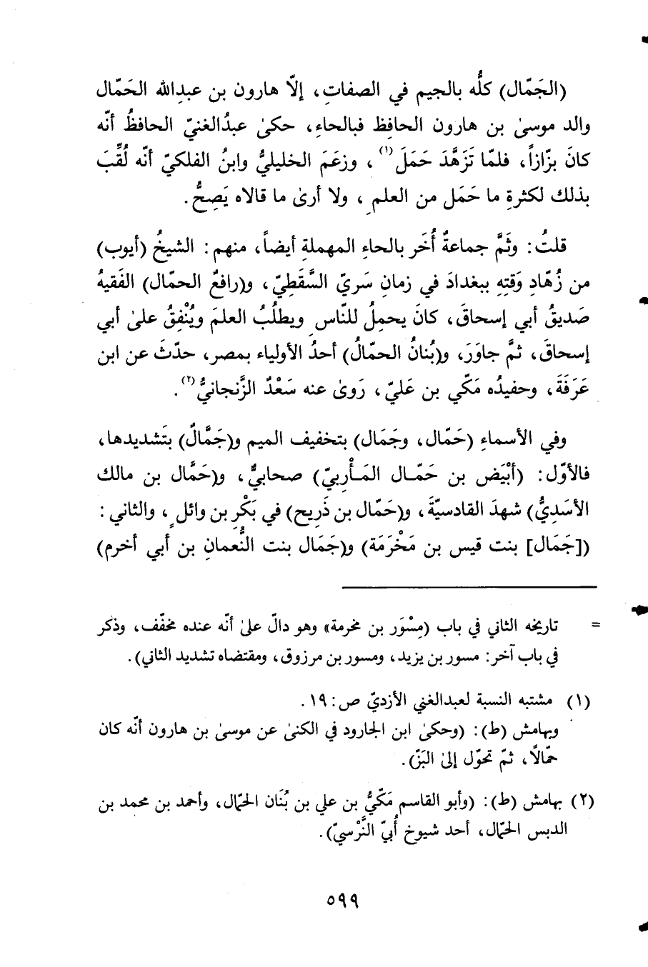 الْجمال كُله بِالْجِيم فِي الصِّفَات إِلَّا هَارُون بن عبد الله الْحمال وَالِد مُوسَى بن هَارُون الْحَافِظ فبالحاء حكى عبد الْغَنِيّ الْحَافِظ أَنه كَانَ بزازا فَلَمَّا تزهد حمل وَزعم الخليلي وَابْن الفلكي أَنه لقب بذلك لِكَثْرَة مَا حمل من الْعلم وَلَا أرى مَا قَالَاه يَصح
