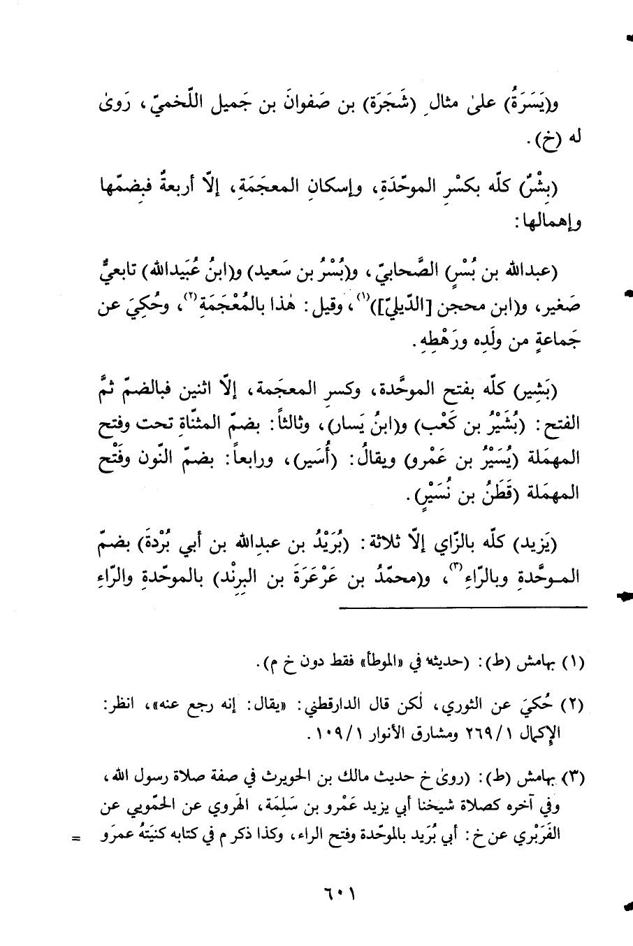 بشير كُله بِفَتْح الْمُوَحدَة وَكسر الْمُعْجَمَة إِلَّا اثْنَيْنِ فبالضم ثمَّ الْفَتْح بشير بن كَعْب وَابْن يسَار وثالثا بِضَم الْمُثَنَّاة تَحت وَفتح الْمُهْملَة يسير بن عَمْرو وَيُقَال أَسِير ورابعا بِضَم النُّون وَفتح الْمُهْملَة قطن بن نسير