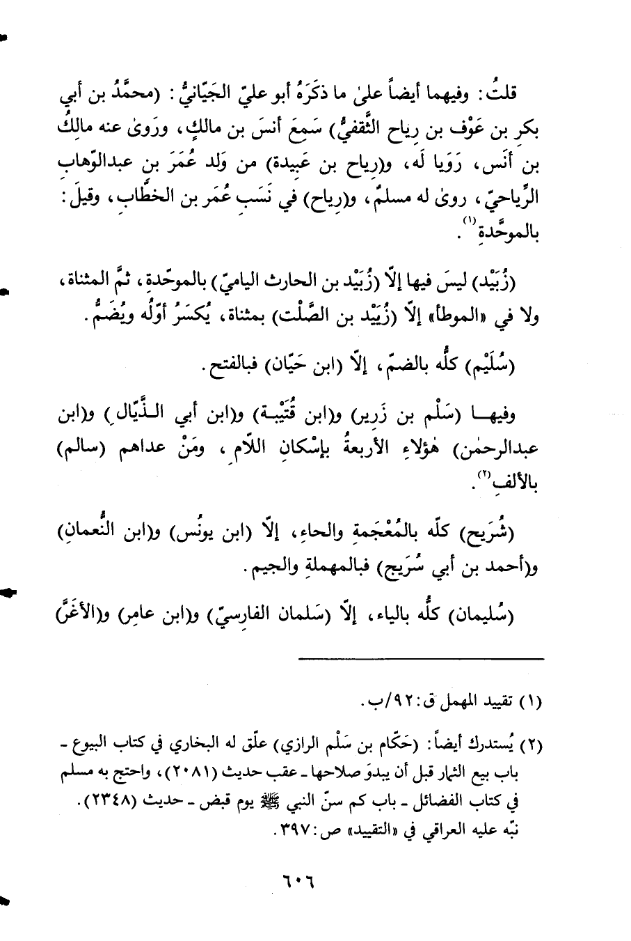 وفيهَا سلم بن زرير وَابْن قُتَيْبَة وَابْن أبي الذَّيَّال وَابْن عبد الرَّحْمَن هَؤُلَاءِ الْأَرْبَعَة بِإِسْكَان اللَّام وَمن عداهم سَالم بِالْألف
