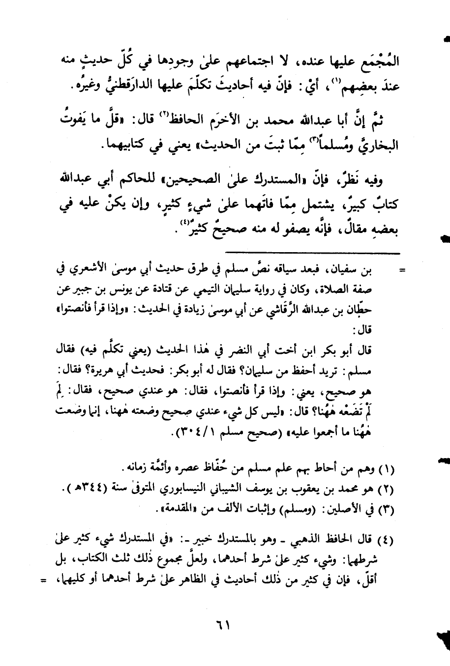 وَفِيه نظر فَإِن 4 الْمُسْتَدْرك على الصَّحِيحَيْنِ للْحَاكِم أبي عبد الله كتاب كَبِير يشْتَمل مِمَّا فاتهما على شَيْء 5 كثير وَإِن يكن عَلَيْهِ فِي بعضه مقَال فَإِنَّهُ يصفو لَهُ مِنْهُ صَحِيح كثير