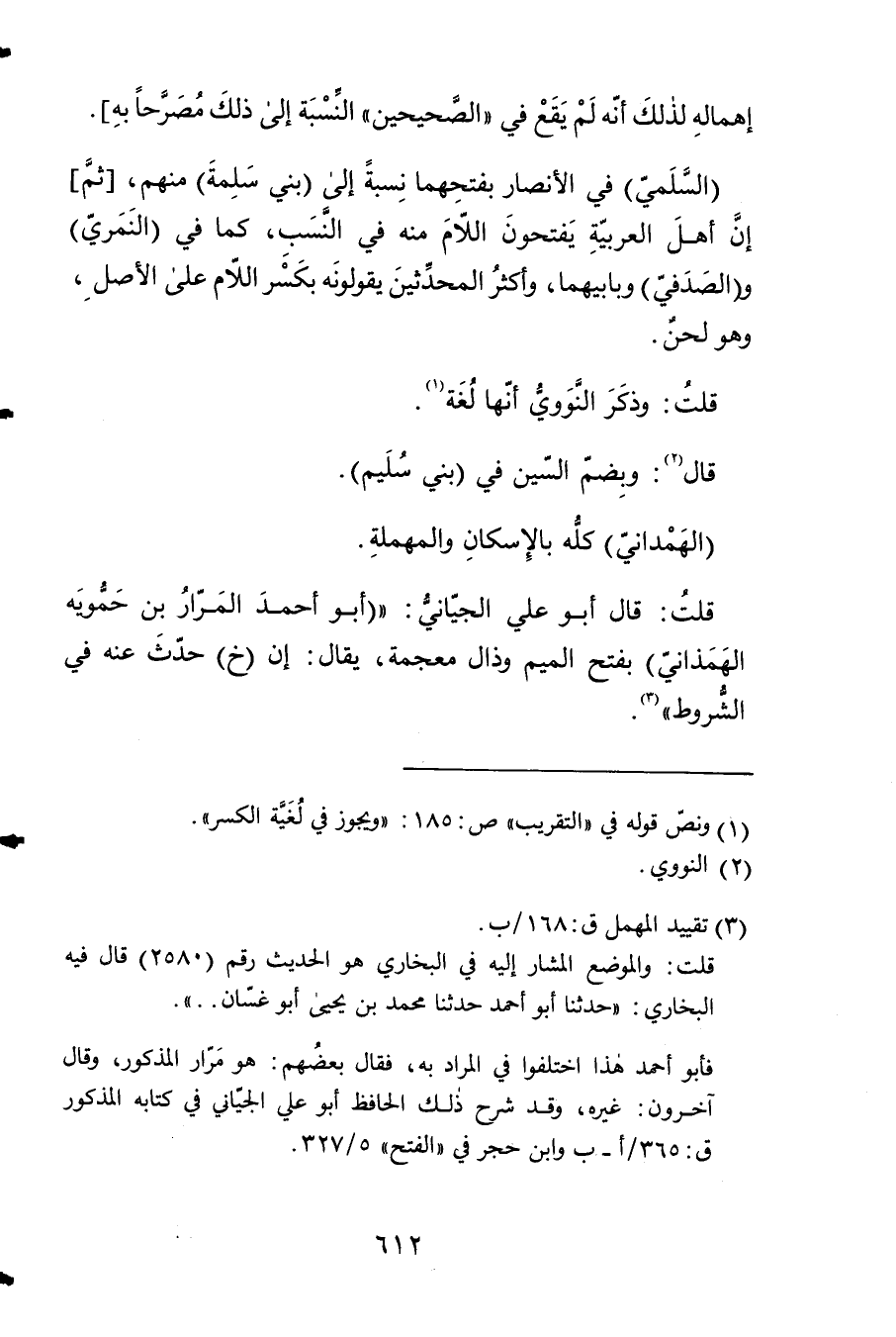 السّلمِيّ فِي الْأَنْصَار بفتحهما نِسْبَة إِلَى بني سَلمَة مِنْهُم ثمَّ إِن أهل الْعَرَبيَّة يفتحون اللَّام مِنْهُ فِي النّسَب كَمَا فِي النمري والصدفي وبابيهما وَأكْثر الْمُحدثين يَقُولُونَهُ بِكَسْر اللَّام على الأَصْل وَهُوَ لحن