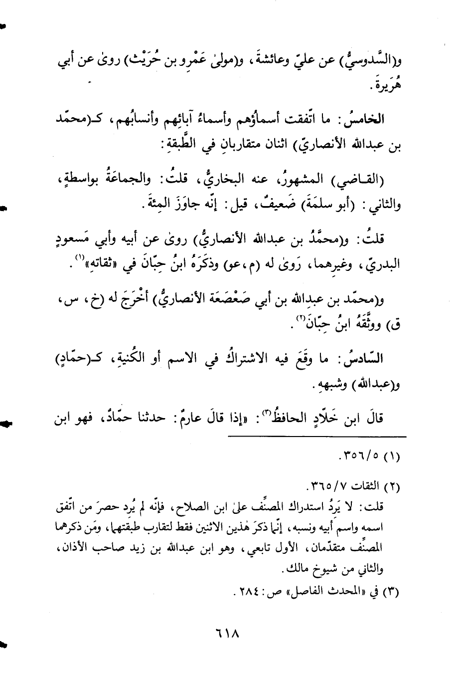 الْخَامِس مَا اتّفقت أَسمَاؤُهُم وَأَسْمَاء آبَائِهِم وأنسباهم كمحمد بن عبد الله الْأنْصَارِيّ اثْنَان متقاربان فِي الطَّبَقَة
