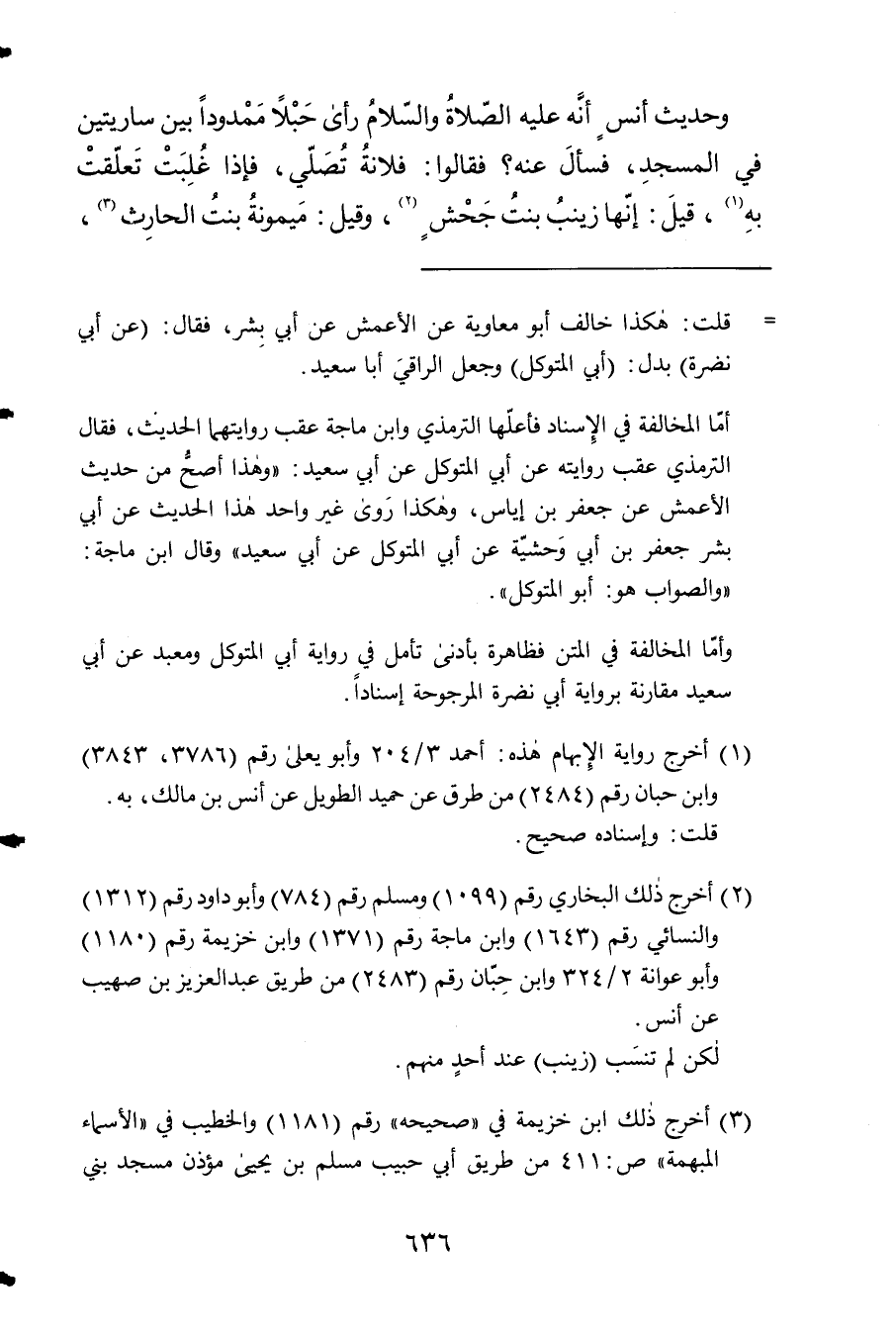 وَحَدِيث أنس أَنه عَلَيْهِ الصَّلَاة وَالسَّلَام رأى حبلا ممدودا بَين ساريتين فِي الْمَسْجِد فَسَأَلَ عَنهُ فَقَالُوا فُلَانَة تصلي فَإِذا غلبت تعلّقت بِهِ قيل إِنَّهَا زَيْنَب بنت جحش وَقيل مَيْمُونَة بنت الْحَارِث