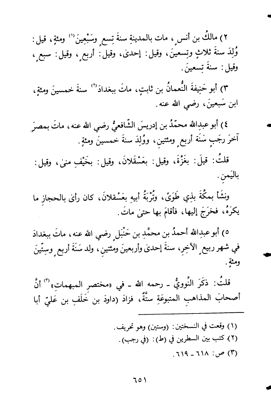 2 - مَالك بن أنس مَاتَ بِالْمَدِينَةِ سنة تسع وَسبعين ومئة قيل ولد سنّ ثَلَاث وَتِسْعين وَقيل إِحْدَى وَقيل أَربع وَقيل سبع وَقيل سنة تسعين