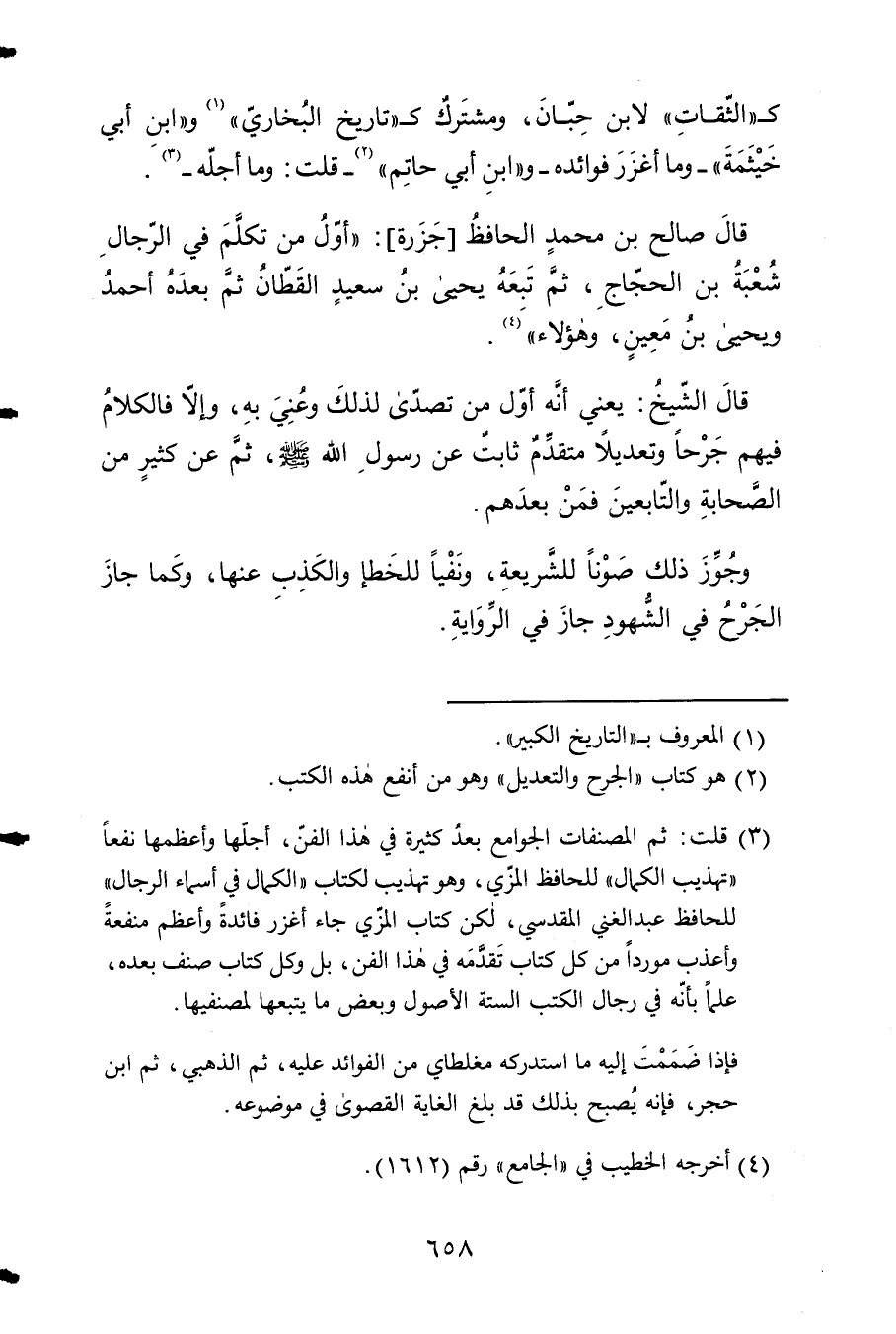 وَجوز ذَلِك صونا للشريعة ونفيا للخطأ وَالْكذب عَنْهَا وكما جَازَ الْجرْح فِي الشُّهُود جَازَ فِي الرِّوَايَة