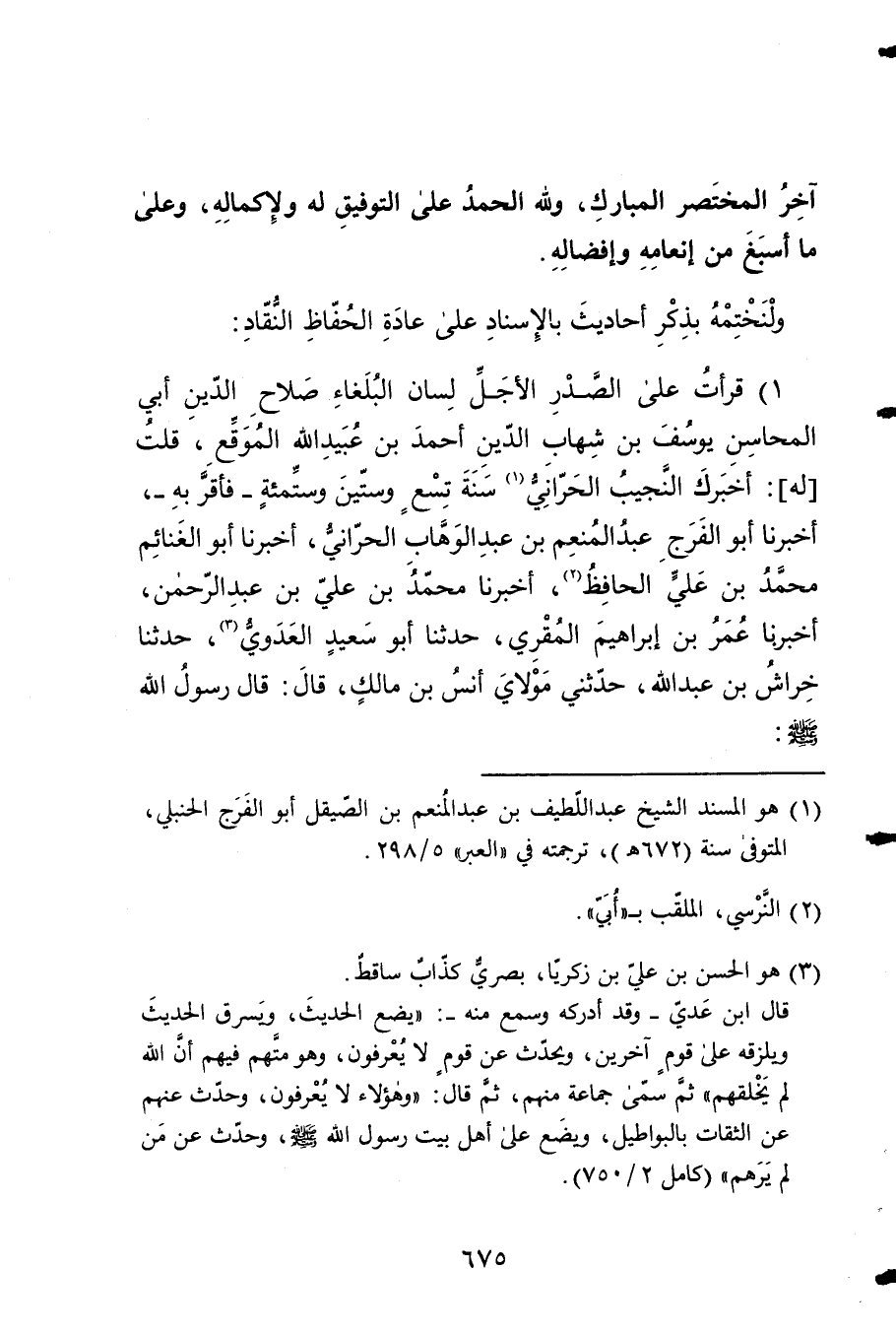 1 - قَرَأت على الصَّدْر الْأَجَل لِسَان البلغاء صَلَاح الدّين أبي المحاسن يُوسُف بن شهَاب الدّين أَحْمد بن عبيد الله الْموقع قلت لَهُ أخْبرك النجيب الْحَرَّانِي سنة تسع وَسِتِّينَ وستمئة فَأقر بِهِ أخبرنَا أَبُو الْفرج عبد الْمُنعم بن عبد الْوَهَّاب الْحَرَّانِي أخبرنَا أَبُو الْغَنَائِم مُحَمَّد بن عَليّ الْحَافِظ أخبرنَا مُحَمَّد بن عَليّ بن عبد الرَّحْمَن أخبرنَا عمر بن إِبْرَاهِيم الْمقري حَدثنَا أَبُو سعيد الْعَدوي حَدثنَا خرَاش بن عبد الله حَدثنِي مولَايَ أنس بن مَالك قَالَ قَالَ رَسُول الله صلى الله عَلَيْهِ وَسلم