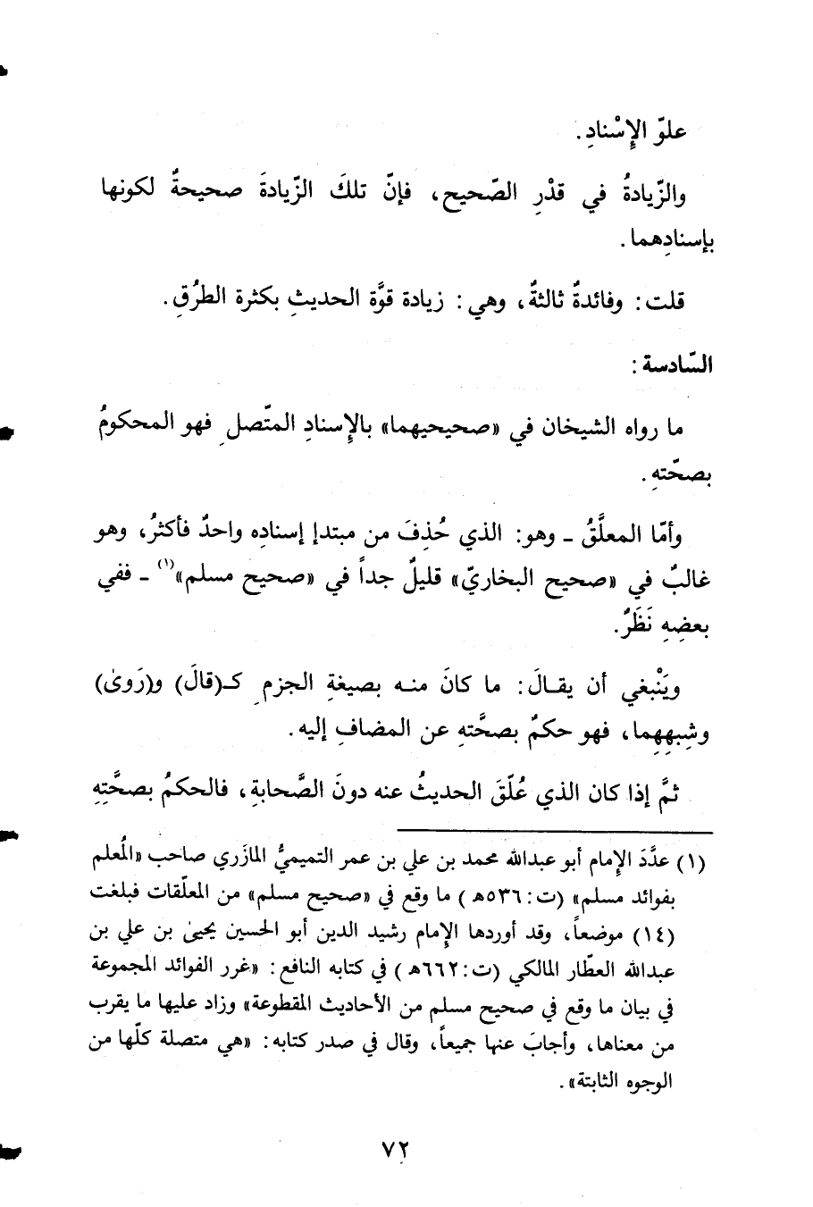 وَأما الْمُعَلق وَهُوَ الَّذِي حذف من مبتدإ 4 إِسْنَاده وَاحِد فَأكْثر وَهُوَ غَالب فِي صَحِيح البُخَارِيّ قَلِيل جدا فِي صَحِيح مُسلم فَفِي بعضه نظر 5