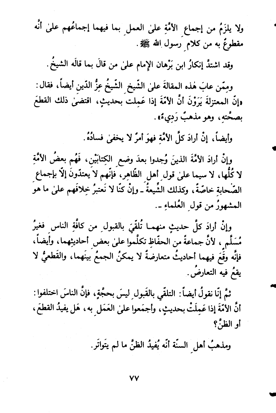 ثمَّ إِنَّا نقُول أَيْضا التلقي بِالْقبُولِ لَيْسَ بِحجَّة فَإِن النَّاس اخْتلفُوا 11 أَن الْأمة إِذا عملت بِحَدِيث وَأَجْمعُوا على الْعَمَل بِهِ هَل يُفِيد الْقطع أَو الظَّن