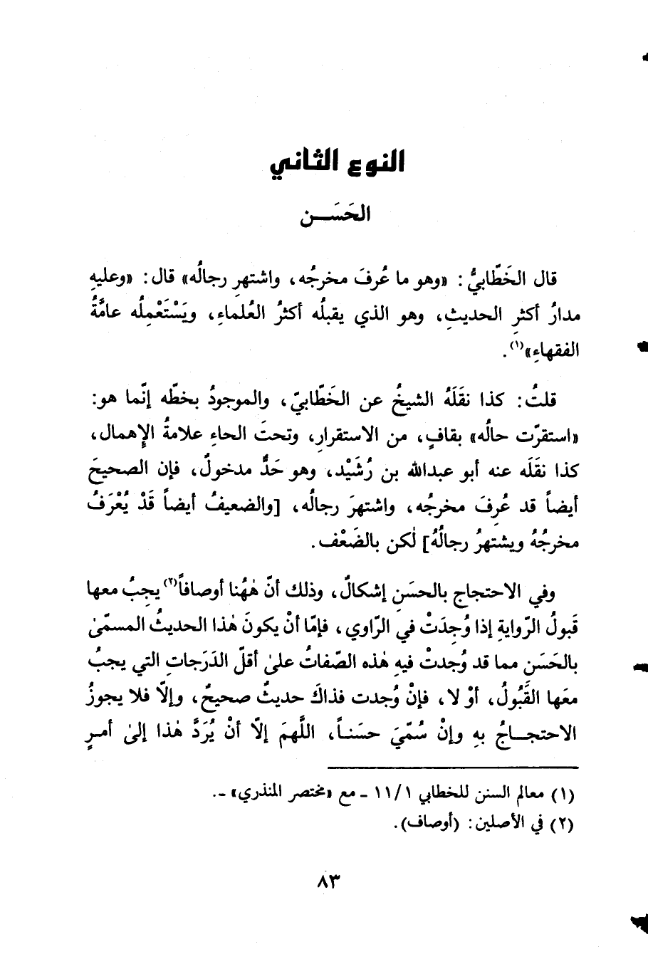 وَفِي الِاحْتِجَاج بالْحسنِ إِشْكَال وَذَلِكَ أَن هَهُنَا أوصافا يجب مَعهَا قبُول الرِّوَايَة إِذا وجدت 7 فِي الرَّاوِي فإمَّا أَن يكون هَذَا الحَدِيث الْمُسَمّى بالْحسنِ مِمَّا قد وجدت فِيهِ هَذِه الصِّفَات على 8 أقل الدَّرَجَات الَّتِي يجب مَعهَا الْقبُول أَولا فَإِن وجدت فَذَاك حَدِيث صَحِيح وَإِلَّا فَلَا يجوز الِاحْتِجَاج 9 بِهِ وَإِن سمي حسنا اللَّهُمَّ إِلَّا أَن يرد هَذَا إِلَى أَمر