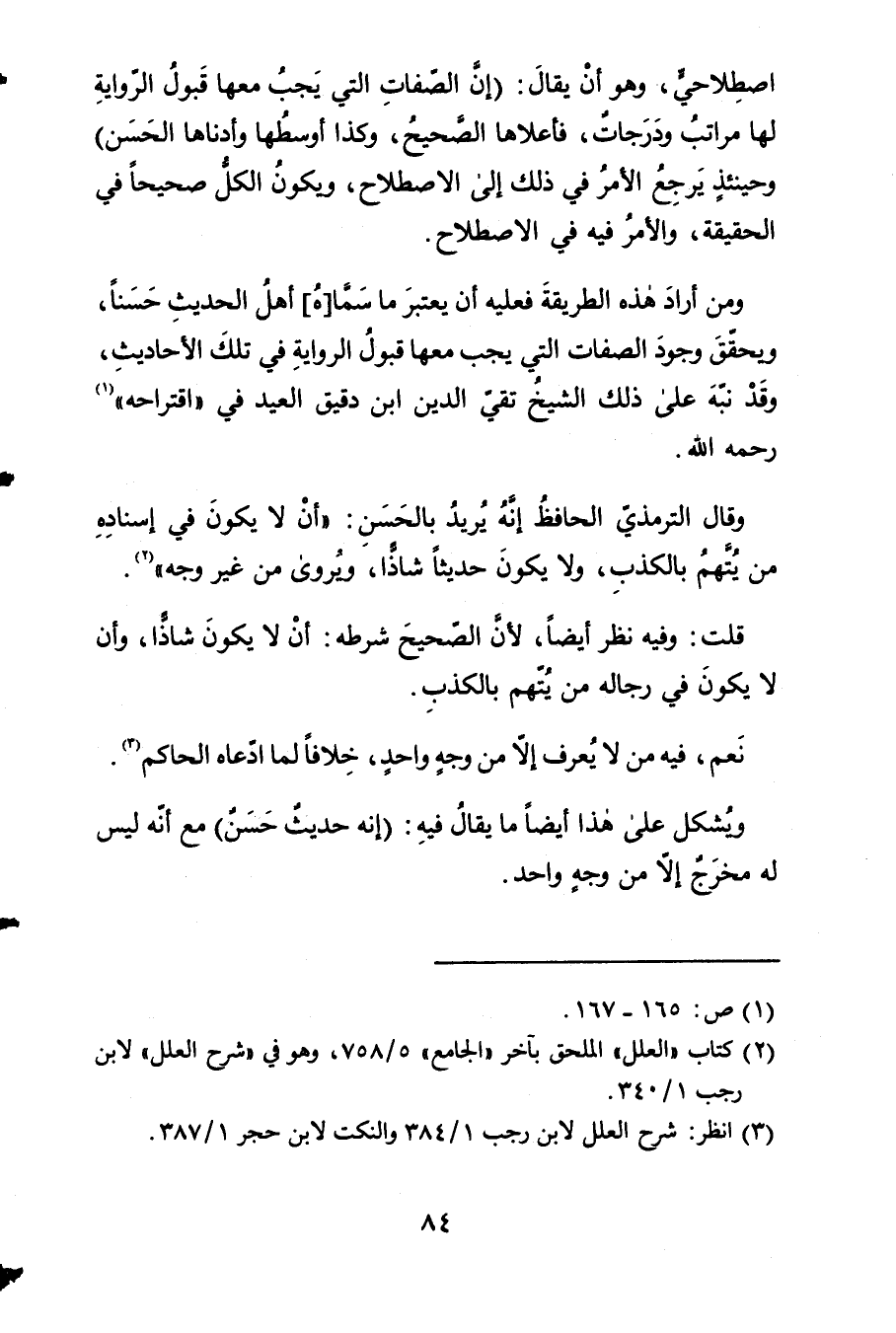 وَمن أَرَادَ هَذِه الطَّرِيقَة فَعَلَيهِ 4 أَن يعْتَبر مَا سَمَّاهُ أهل الحَدِيث حسنا ويحقق وجود الصِّفَات الَّتِي يجب مَعهَا قبُول الرِّوَايَة 5 فِي تِلْكَ الْأَحَادِيث وَقد نبه على ذَلِك الشَّيْخ تَقِيّ الدّين ابْن دَقِيق الْعِيد فِي اقتراحه رَحمَه 6 الله
