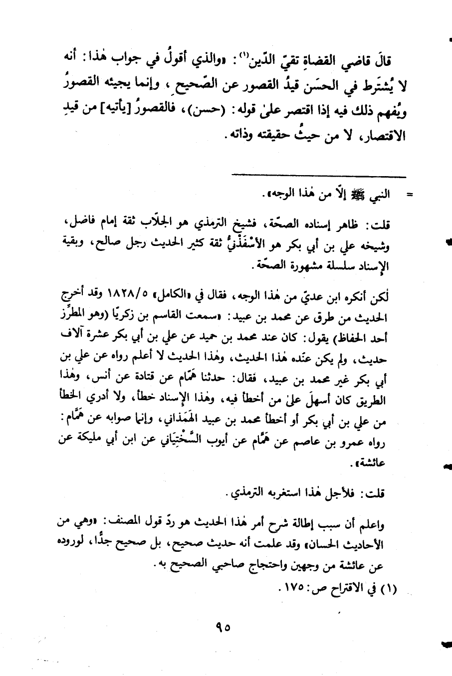 1 - قَالَ قَاضِي الْقُضَاة تَقِيّ الدّين وَالَّذِي أَقُول فِي جَوَاب هَذَا أَنه لَا يشْتَرط فِي الْحسن قيد 2 الْقُصُور عَن الصَّحِيح وَإِنَّمَا يَجِيئهُ الْقُصُور وَيفهم ذَلِك فِيهِ إِذا اقْتصر على قَوْله حسن فالقصور 3 يَأْتِيهِ من قيد الِاقْتِصَار لَا من حَيْثُ حَقِيقَته وذاته