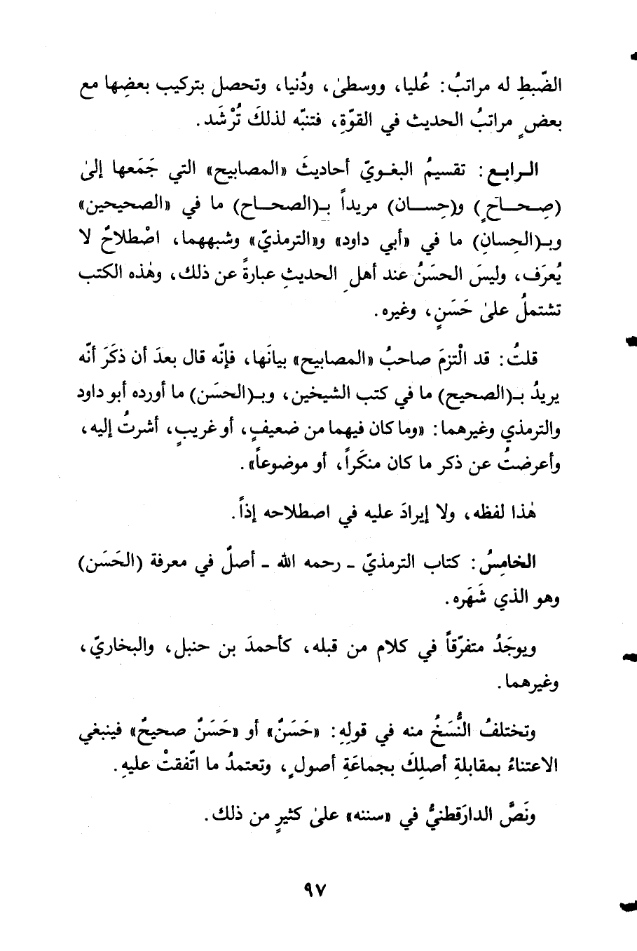 وتختلف 10 النّسخ مِنْهُ فِي قَوْله حسن أَو حسن صَحِيح فَيَنْبَغِي الاعتناء بِمُقَابلَة أصلك بِجَمَاعَة أصُول وتعتمد 11 مَا اتّفقت عَلَيْهِ وَنَصّ الدَّارَقُطْنِيّ فِي سنَنه على كثير من ذَلِك