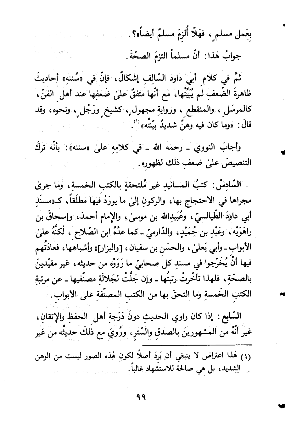 السَّادِس كتب المسانيد غير ملتحقة بالكتب الْخَمْسَة وَمَا جرى مجْراهَا 6 فِي الِاحْتِجَاج بهَا والركون إِلَى مَا يُورد فِيهَا مُطلقًا ك مُسْند أبي دَاوُد الطياليسي وَعبيد 7 الله بن مُوسَى وَالْإِمَام أَحْمد وَإِسْحَاق بن رَاهَوَيْه وَعبد بن حميد والدارمي كَمَا عده ابْن 8 الصّلاح لكنه على الْأَبْوَاب وَأبي يعلى وَالْحسن بن سُفْيَان وَالْبَزَّار وأشباهها فعادتهم فِيهَا 9 أَن يخرجُوا فِي مُسْند كل صَحَابِيّ مَا رَوَوْهُ من حَدِيثه غير مقيدين بِالصِّحَّةِ فَلهَذَا تَأَخَّرت رتبتها 10 وَإِن جلت لجلالة مصنفيها عَن مرتبَة الْكتب الْخَمْسَة وَمَا الْتحق بهَا من الْكتب المصنفة 11 على الْأَبْوَاب
