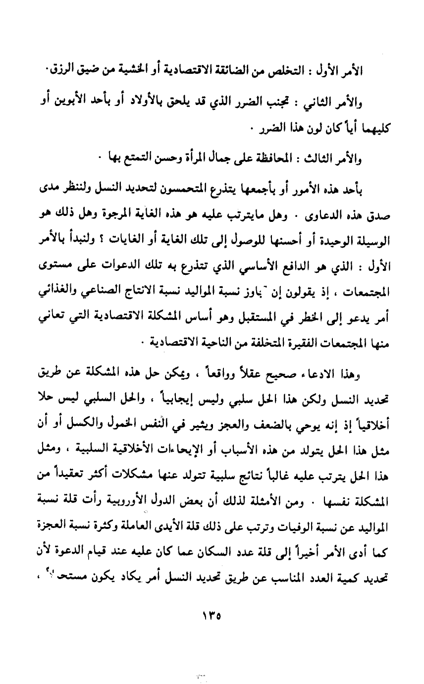 قادرًا على القيام بنفقات الأولاد, وإذا كان قادرًا على ذلك فلا يصح تحديد النسل، ثم إن للتحديد بالطرق المعروفة حاليًا أضرارًا من جهات مختلفة, كما لا يصح تقييم كل سلوك إنساني من وجهة النظر الاقتصادية وحدها.