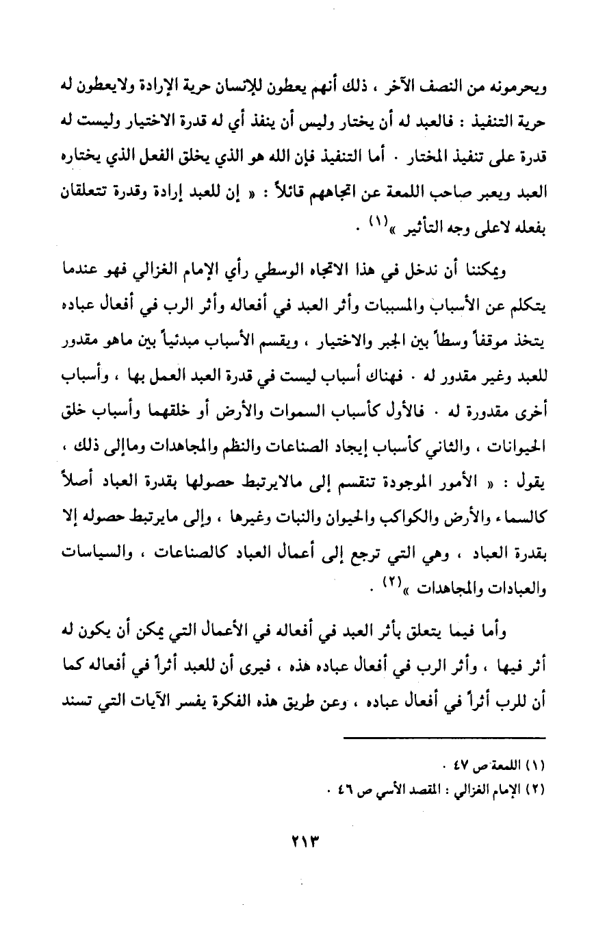 ونجد كذلك نصوصاً تؤيد الاتجاه الثاني القائل بحرية الإرادة، مثل النصوص الآتية: {وَقُلِ الْحَقُّ مِنْ رَبِّكُمْ فَمَنْ شَاءَ فَلْيُؤْمِنْ وَمَنْ شَاءَ فَلْيَكْفُرْ} 2، {سَيَقُولُ الَّذِينَ أَشْرَكُوا لَوْ شَاءَ اللَّهُ مَا أَشْرَكْنَا وَلا آبَاؤُنَا وَلا حَرَّمْنَا مِنْ شَيْءٍ كَذَلِكَ كَذَّبَ الَّذِينَ مِنْ قَبْلِهِمْ حَتَّى ذَاقُوا بَأْسَنَا قُلْ هَلْ عِنْدَكُمْ مِنْ عِلْمٍ فَتُخْرِجُوهُ لَنَا إِنْ تَتَّبِعُونَ إِلَّا الظَّنَّ وَإِنْ أَنْتُمْ إِلَّا تَخْرُصُونَ} 3، {وَمَنْ يُرِدْ ثَوَابَ الدُّنْيَا نُؤْتِهِ مِنْهَا وَمَنْ يُرِدْ ثَوَابَ الْآخِرَةِ نُؤْتِهِ مِنْهَا وَسَنَجْزِي الشَّاكِرِينَ} 4.