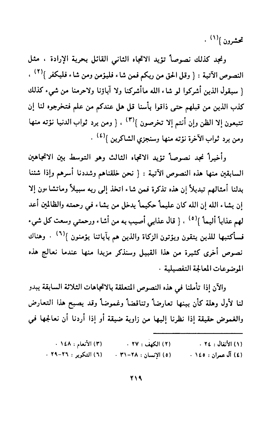 والآن على ضوء هذه الفكرة نستطيع أن ندرك حقيقة مغزي الآيات التي تجمع بين الجبرية والحرية أو بين المشيئة الإلهية وحرية الاختيار للإنسان.