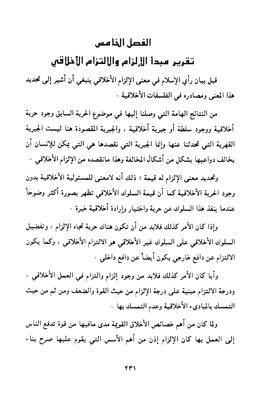 إن مجالات الالتزام الأخلاقي هي مجالات الخير كله فإن الإنسان ملزم بعمل الخير وتجنب الشر في كل وقت وفي كل مكان، غير أن الخيرات كثيرة فلا يستطيع الإنسان عمل الخيرات كلها طولاً وعرضاً، إذ إن قدراته محدودة وزمنه كذلك محدود فلا بد إذن من أن تكون هناك درجات في الإلزام ومراتب في الأعمال الأخلاقية حتى لا يقف الإنسان موقف الحيرة في فعل بعضها وترك بعضها الآخر وخاصة إذا كان هناك تعارض وإذا أدى فعل بعضها إلى ترك بعضها الآخر، لذا نرى أن الإسلام رتب الأعمال الأخلاقية إلى لازم وألزم فألزمها فرض العين ثم فرض الكفاية ثم الواجب ثم السنة المؤكدة ثم السنة غير المؤكدة ثم النوافل وأخيراً الكماليات. كذلك رتب المحرمات أو الشرور إلى كبائر وصغائر ثم المكروهات وخلاف الأولى. ثم قسمها من جهة أخرى من حيث الواجبات المحدودة وغير المحدودة والمؤقتة وغير المؤقتة. وحدد مسافة بين الخير والشر لا هي خير ولا هي شر وهي المباحات وأحد طرفيها متصل بالخير والآخر متصل بالشر وأمر الناس بالاتجاه نحو الخير والابتعاد عن الشر؛ لأن الذي يرتع حول حدود الشيء يوشك أن يقع فيه، فقد شبه الرسول موقف الإنسان من حدود المحرمات بموقف الراعي الذي يرعى حول الحمى فإنه يوشك أن يتجاوز حدوده إذا اقترب منها فقال: "الحلال بيِّن والحرام بيِّن وبينهما مشتبهات لا يعلمها كثير من الناس، فمن اتقى الشبهات فقد استبرأ لدينه وعرضه ومن وقع في الشبهات كراعٍ يرعى حول الحمى يوشك أن يواقعه، ألا وإن لكل ملك حمى ألا وإن حمى الله في أرضه محارمه" 1. وقال: "دع ما يريبك إلى ما لا يريبك" 2، والحقيقة أن معالجة