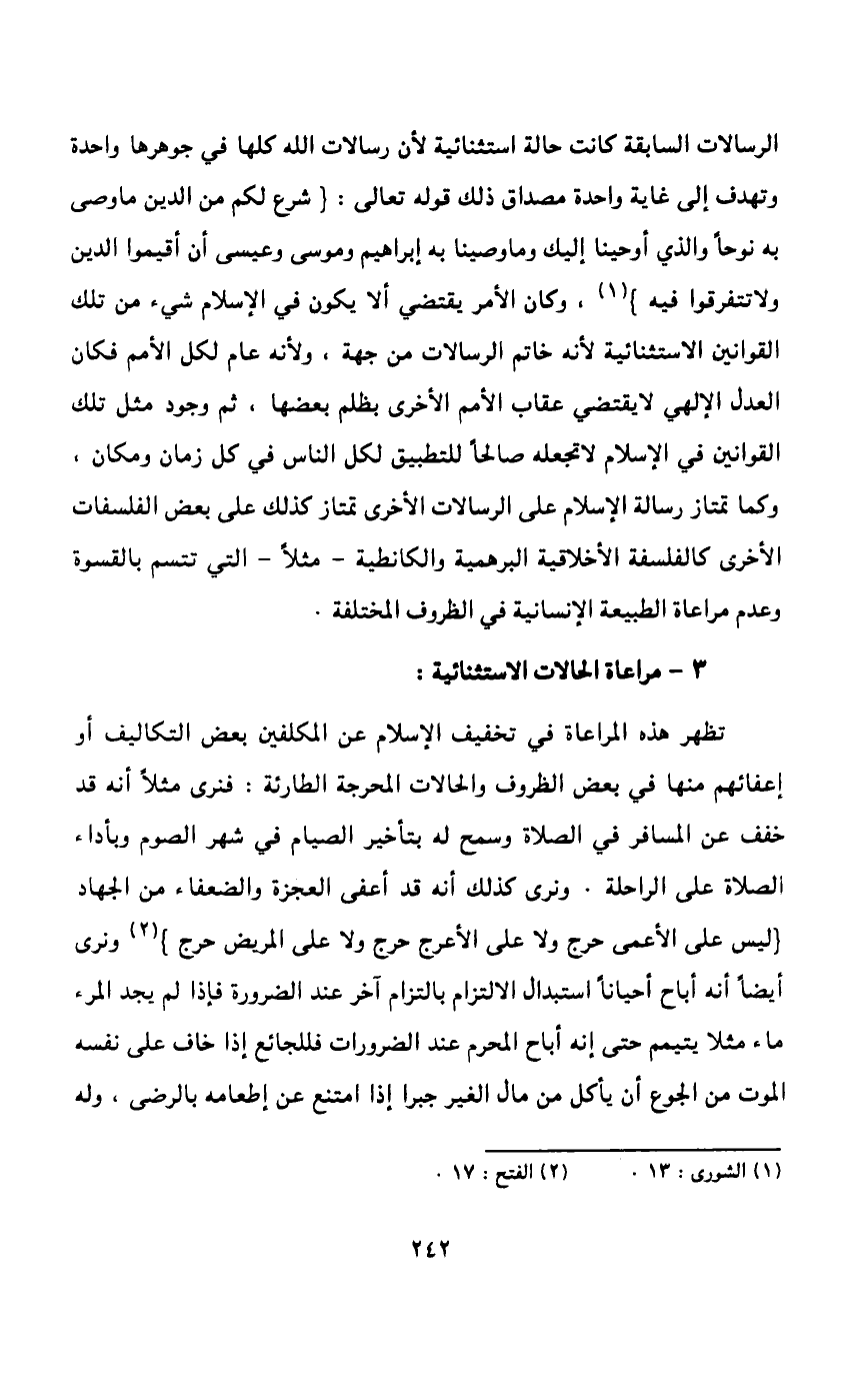 2 يعرف الإمام الشاطبي حد الضرورة فيقول: "إنه إذا كان العمل يؤدي الدوام عليه إلى الانقطاع عنه أو عن بعضه أو إلى وقوع خلل في صاحبه.. في نفسه أو ماله أو حال من أحواله فالمشقة هنا خارجة عن المعتاد" الموافقات جـ 2 ص 87.