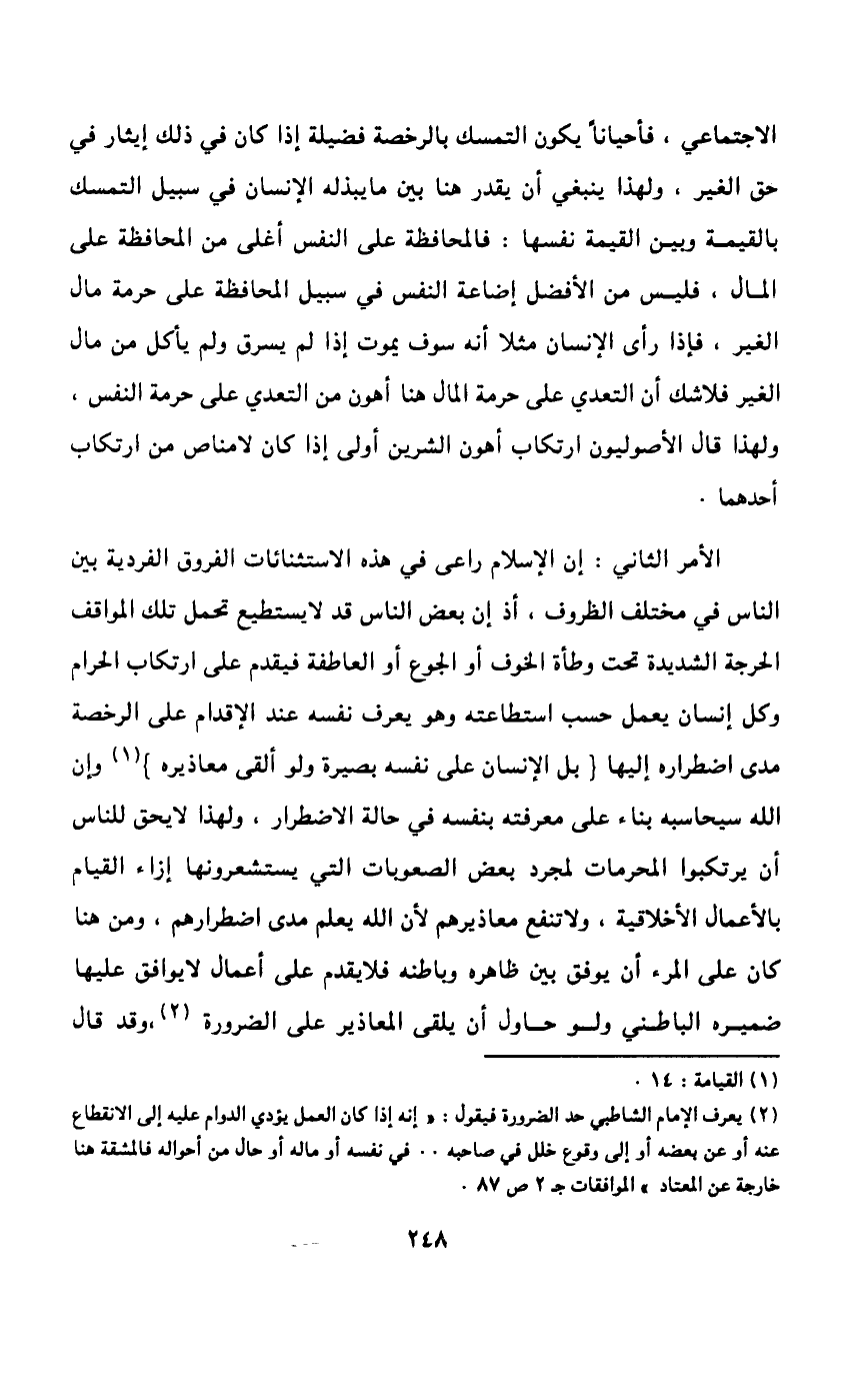 إذن فما نقوله هنا ليس مجرد دعوى لتبرير المسئولية الأخلاقية التي تحملها الإنسان بإلزام والتزام وعن جدارة {إِنَّا عَرَضْنَا الأَمَانَةَ عَلَى السَّمَوَاتِ وَالأَرْضِ وَالْجِبَالِ فَأَبَيْنَ أَنْ يَحْمِلْنَهَا وَأَشْفَقْنَ مِنْهَا وَحَمَلَهَا الإِنْسَانُ إِنَّهُ كَانَ ظَلُوماً جَهُولاً} 1، وهذه الآية توجهنا إلى فهم طبيعة التفكير الأخلاقي في الإسلام وطبيعة موقف الإنسان من الأخلاق، لذا يجدر بنا أن نقف عندها وقفة قصيرة لإبراز أهم ما تحمل من المفاهيم الهامة, فمن هذه المفاهيم: مفهوم الأمانة الذي حددته الآية السابقة لها وهي قوله تعالى: {يَا أَيُّهَا الَّذِينَ آمَنُوا اتَّقُوا اللَّهَ وَقُولُوا قَوْلاً سَدِيداً, يُصْلِحْ لَكُمْ أَعْمَالَكُمْ وَيَغْفِرْ لَكُمْ ذُنُوبَكُمْ وَمَنْ يُطِعِ اللَّهَ وَرَسُولَهُ فَقَدْ فَازَ فَوْزاً عَظِيماً} 2، فالأمانة إذن هي الصدق في الكلام، والعمل الصالح الخير وأن يتم هذا وذاك بروح الطاعة والتقوى لله.