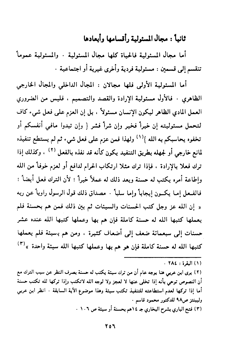 وأما عن وجهة نظر الإسلام فإنا نجد نصوصاً تقرر المسئولية الفردية بصورة مطلقة كأن الفرد مسئول عن نفسه فقط، فقال تعالى: {وَلا تَكْسِبُ كُلُّ نَفْسٍ إِلاَّ عَلَيْهَا وَلا تَزِرُ وَازِرَةٌ وِزْرَ أُخْرَى} 2, {يَا أَيُّهَا الَّذِينَ آمَنُوا عَلَيْكُمْ أَنفُسَكُمْ لا يَضُرُّكُمْ مَنْ ضَلَّ إِذَا اهْتَدَيْتُمْ} 3، لكن نجد أيضاً نصوصا تقرر مسئولية الفرد عن سلوك غيره، من هذه النصوص قوله تعالى: {وَاتَّقُوا فِتْنَةً لا تُصِيبَنَّ الَّذِينَ ظَلَمُوا مِنْكُمْ خَاصَّةً وَاعْلَمُوا أَنَّ اللَّهَ شَدِيدُ الْعِقَابِ} 4، {يَا بُنَيَّ أَقِمِ الصَّلاةَ وَأْمُرْ بِالْمَعْرُوفِ وَانْهَ عَنِ الْمُنكَرِ إِنَّ ذَلِكَ مِنْ عَزْمِ الأُمُورِ} 5، وقال الرسول صلى الله عليه وسلم -بعد ما تلا قوله تعالى: {لُعِنَ الَّذِينَ كَفَرُوا مِنْ بَنِي إِسْرَائِيلَ عَلَى لِسَانِ دَاوُدَ وَعِيسَى ابْنِ مَرْيَمَ ذَلِكَ بِمَا عَصَوْا وَكَانُوا يَعْتَدُونَ, كَانُوا لا يَتَنَاهَوْنَ عَنْ مُنكَرٍ فَعَلُوهُ لَبِئْسَ مَا كَانُوا يَفْعَلُونَ} 6: "كلا والله لتأمرن بالمعروف ولتنهون عن المنكر ولتأخذن على يد