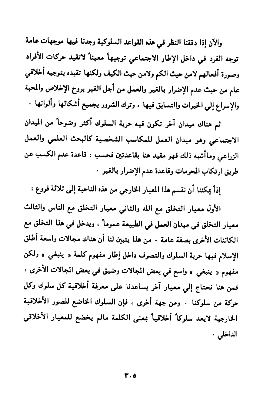 فدور النية والغاية في السلوك الأخلاقي هام إذ لا يكفي أن يكون السلوك مطابقا للقانون الأخلاقي من حيث الصورة الخارجية بل لا بد للسلوك الأخلاقي من شكل ومضمون أو مادة وروح، ولهذا قال الرسول -صلى الله عليه وسلم: "إنما الأعمال بالنيات وإنما لكل امرئ ما نوى، فمن كانت هجرته إلى دنيا يصيبها أو إلى امرأة ينكحها فهجرته إلى ما هاجر إليه" 1، وقد بينا في المسئولية أن مجالها قسمان: ظاهري وباطني، ظاهرها الفعل المادي، وباطنها النية والغاية، فمن نوى نية حسنة فله أجر العمل بها وإن لم يستطع إلى ذلك سبيلا، وكذلك من نوى نية سيئة فعليه وزر العمل بها إذا حالت بينه وبين تنفيذها عوامل خارجية. والنية الحسنة تجعل الأعمال المباحة عبادة يثاب فاعلها عليها؛ فإذا نوى عند الأكل أنه إنما يأكل لأداء واجباته في الحياة يثاب عليها، حتى إتيان الرجل امرأته؛ فإذا نوى عند
