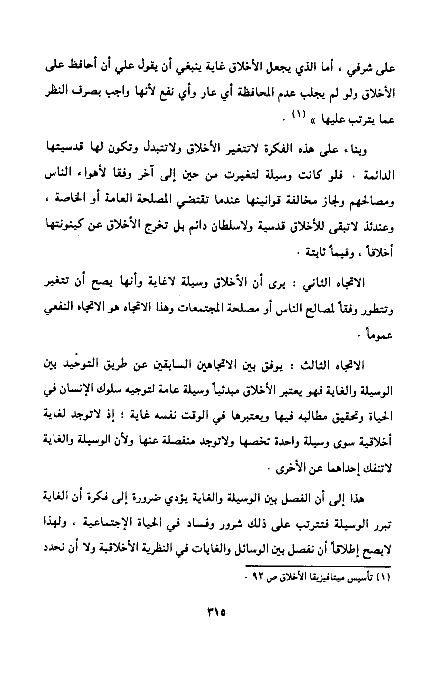 من هذا كله نقرر أن الأخلاق وسيلة من جهة وغاية من جهة أخرى وقيمة الغاية تؤثر في قيمة العمل الأخلاقي، وكلما كانت الغاية أسمى وأشرف كان السلوك الأخلاقي أكثر قيمة، ولكن الغائية في السلوك الأخلاقي لا تفيد عدم موضوعية المبادئ الأخلاقية، ولا تفيد كذلك عدم وجود قدسية للأخلاق.