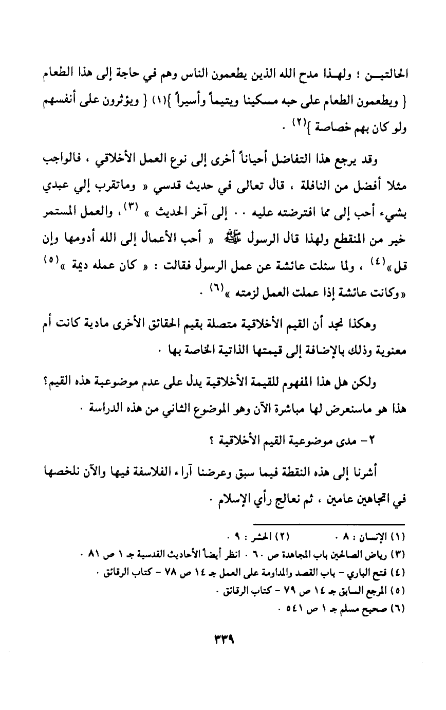 إذن للقيم الأخلاقية جوانب متعددة: ففيها الموضوعية وفيها غير الموضوعية إذا نظرنا إليها من زاوية الموضوعية واللا موضوعية التقليدية, ولا ينقص من قيمة الأخلاق أنه لا يمكن تقويمها بالمعيار الموضوعي التقليدي؛ لأن المعيار السماوي معيار أيضا. والمعيار الإنساني معيار كذلك كالمعيار التجريبي العلمي, ومن هذه الزاوية تعد القيم الأخلاقية كلها موضوعية ولكن بمعنى آخر, ثم إن وجود القيم السماوية والأرضية والإنسانية في القيم الأخلاقية تدل على عظمة القيم الأخلاقية وعظيم قدرها.